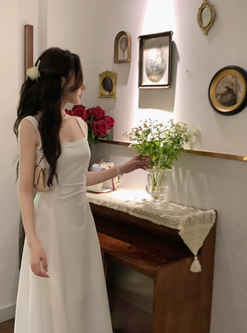 French square neck suspender dress with slim waist, elegant and gentle temperament R1505