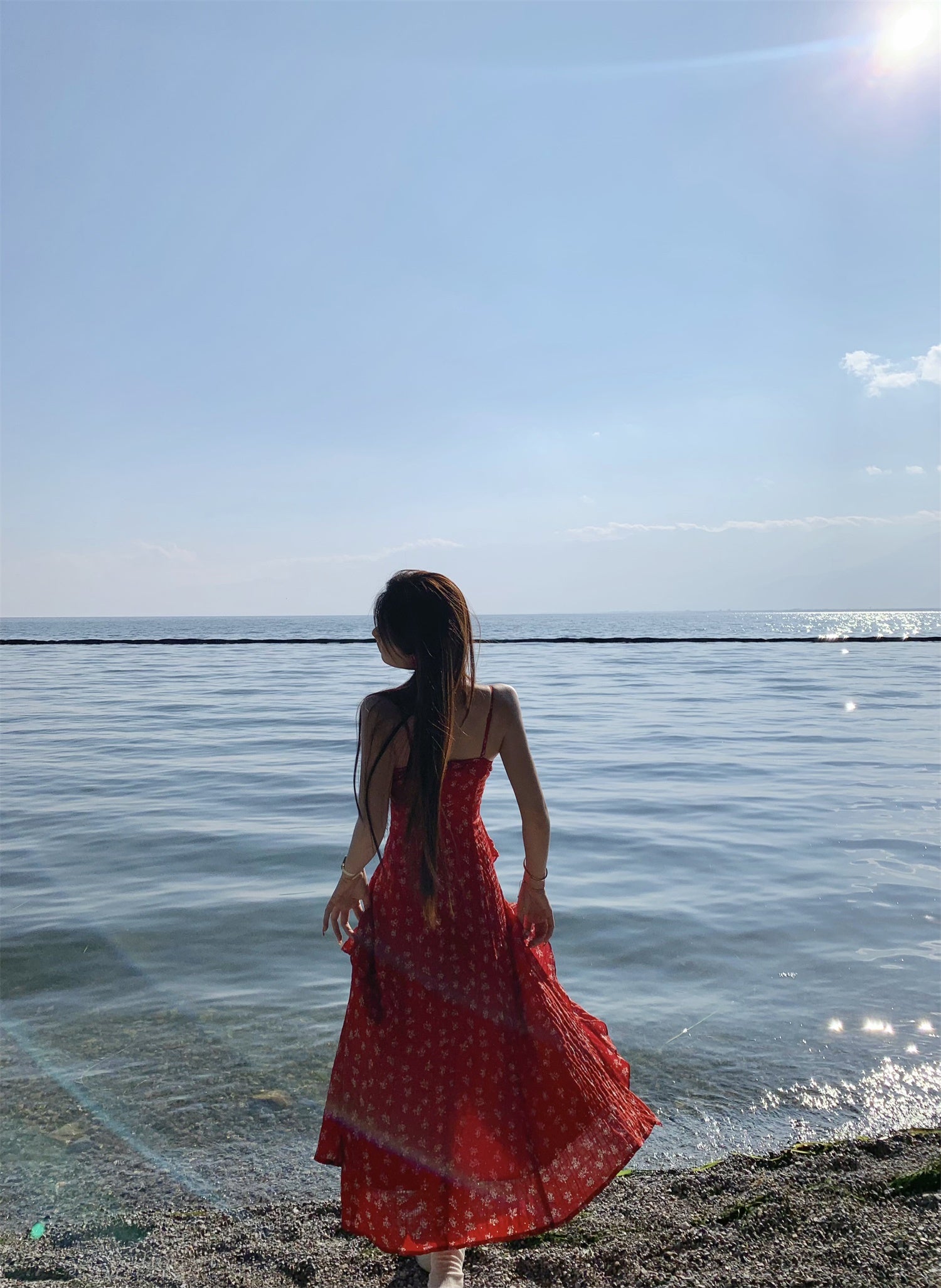 French style beautiful red suspender dress irregular slit long skirt R3865