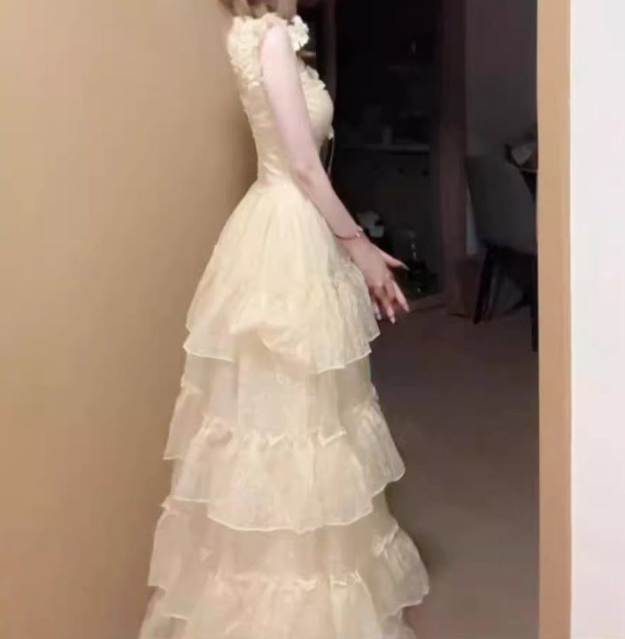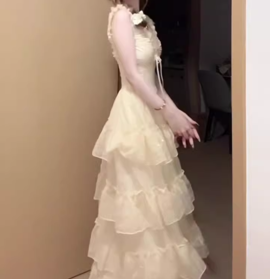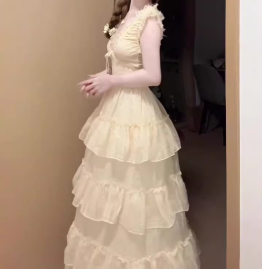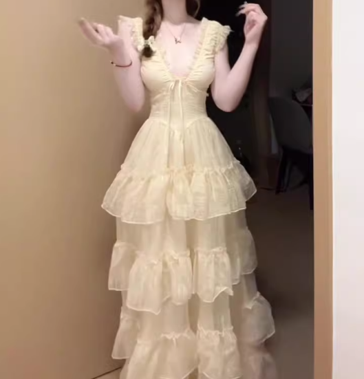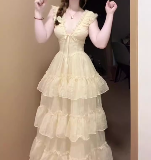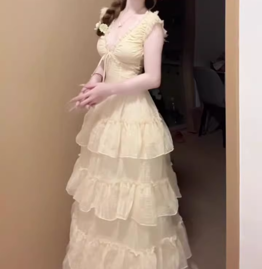 Gentle and sweet style V-neck suspender dress temperament waist beautiful skirt R0710