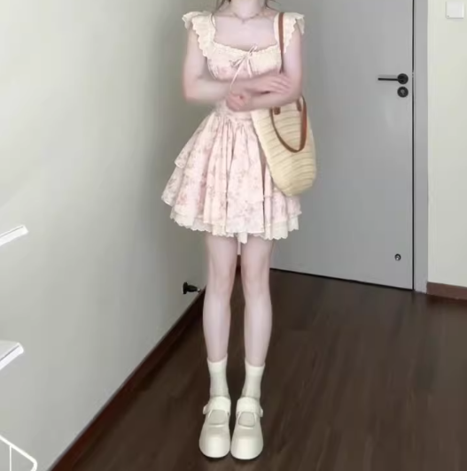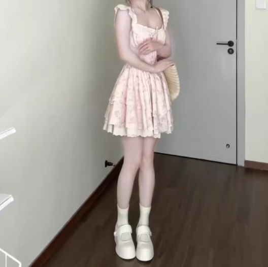 Gentle style pink floral dress beautiful waist A-line tutu skirt R0736