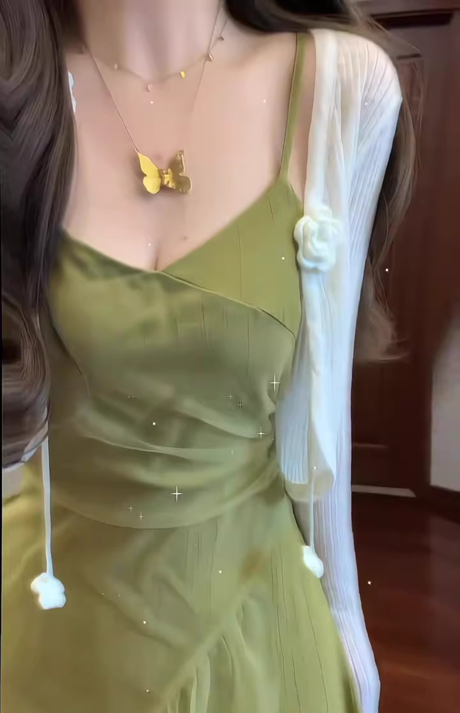 Gentle temperament green suspender dress retro beautiful waist slim a-line long skirt R0704
