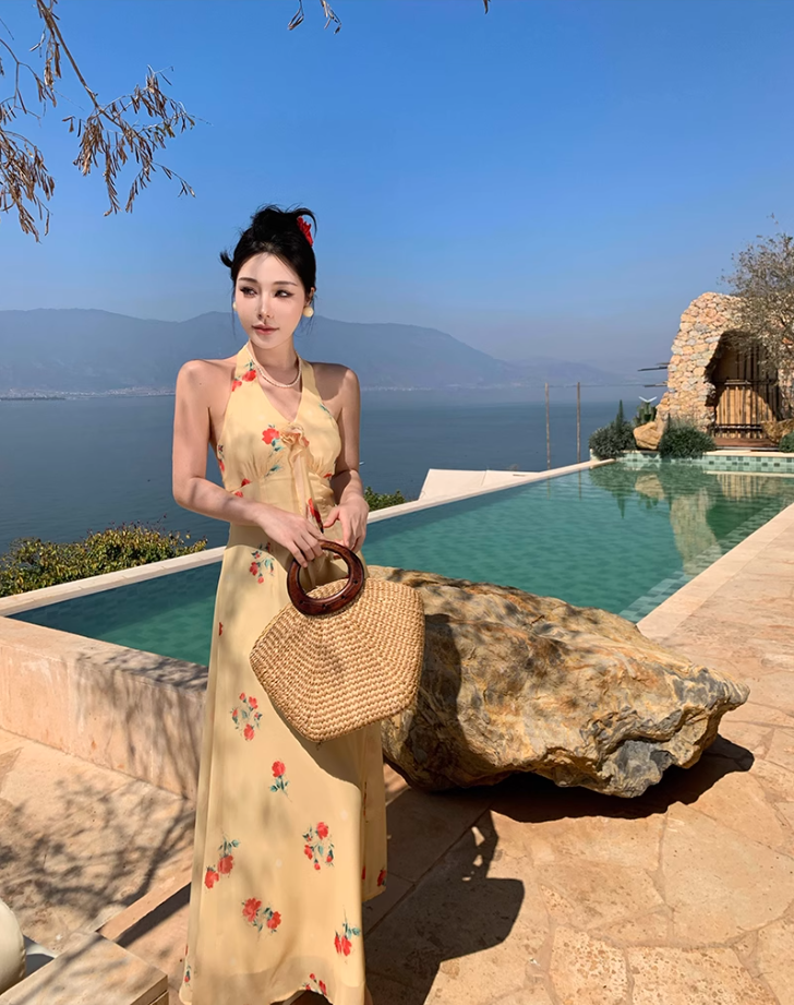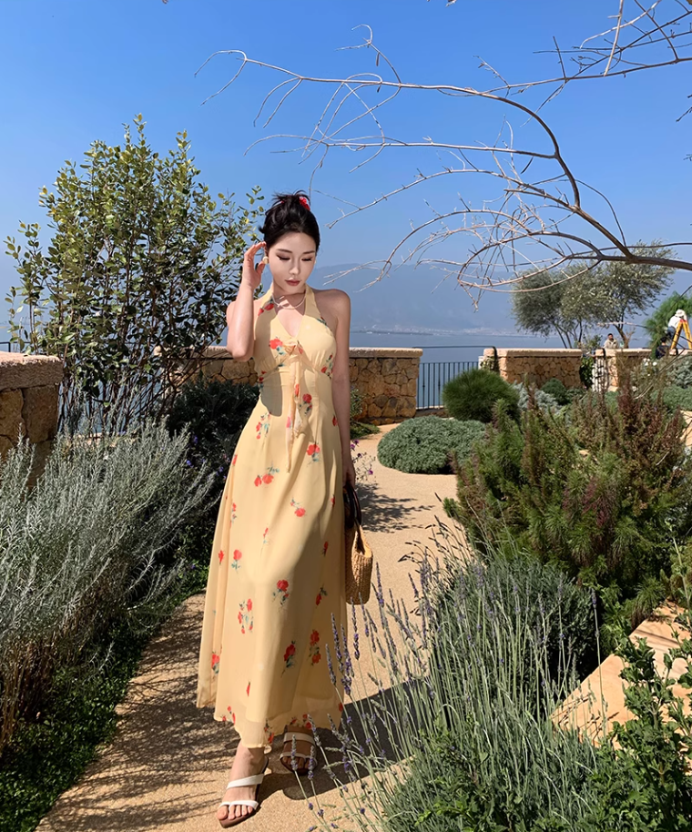 Gentle temperament halter neck floral dress beautiful waist backless A-line long skirt R0740