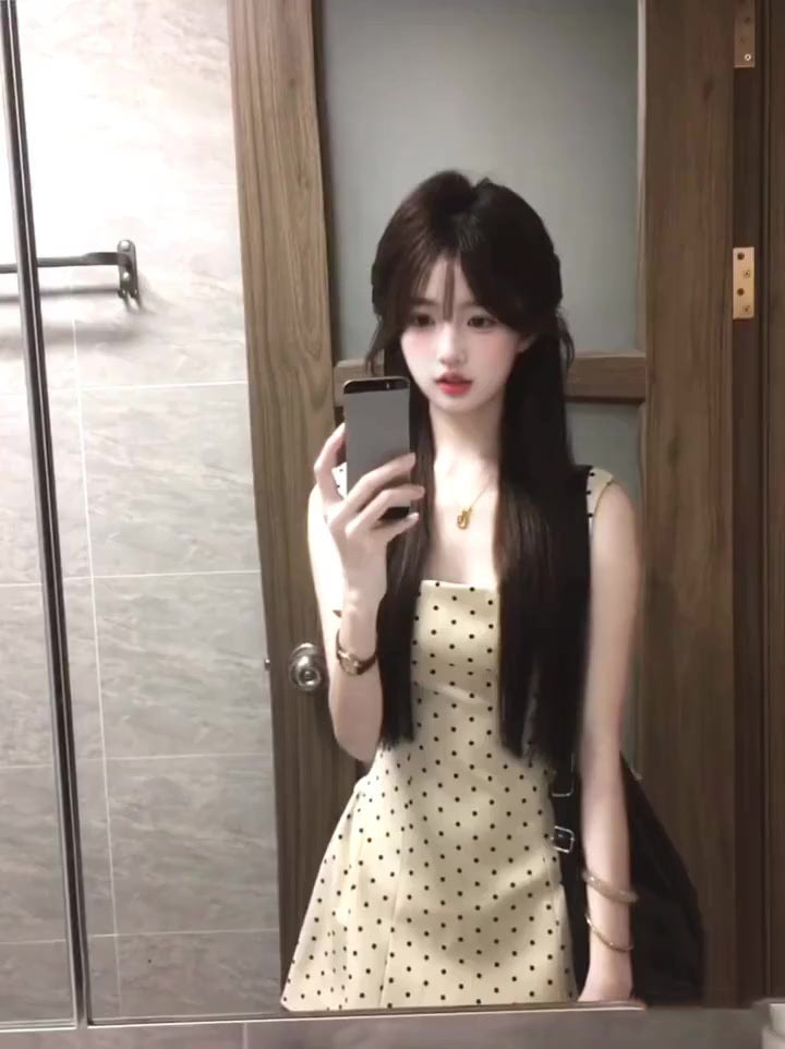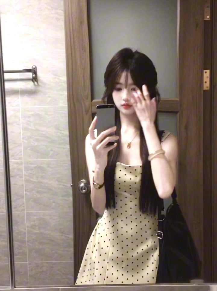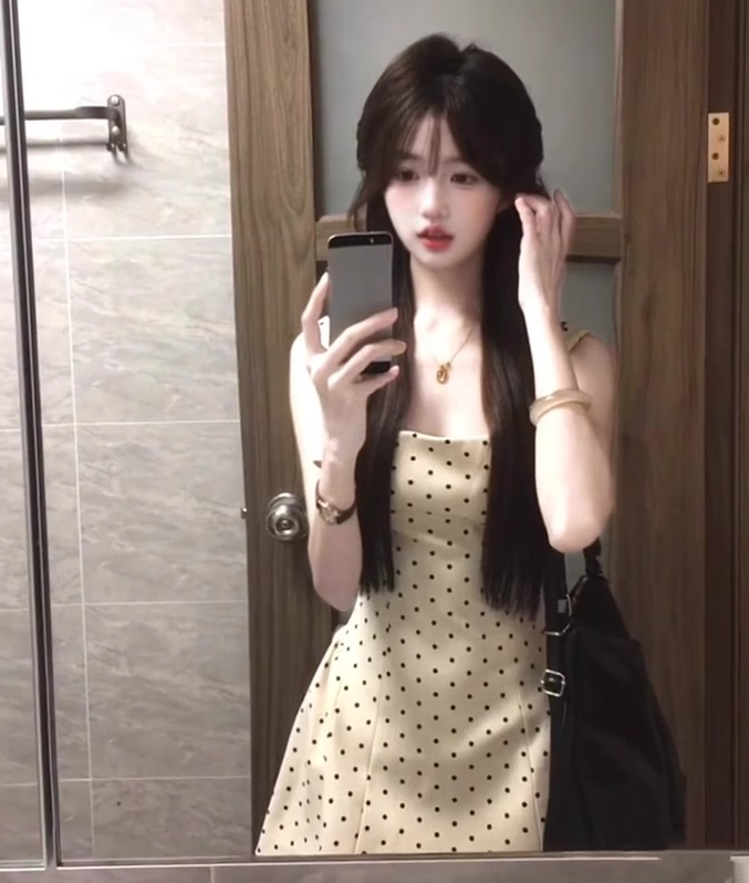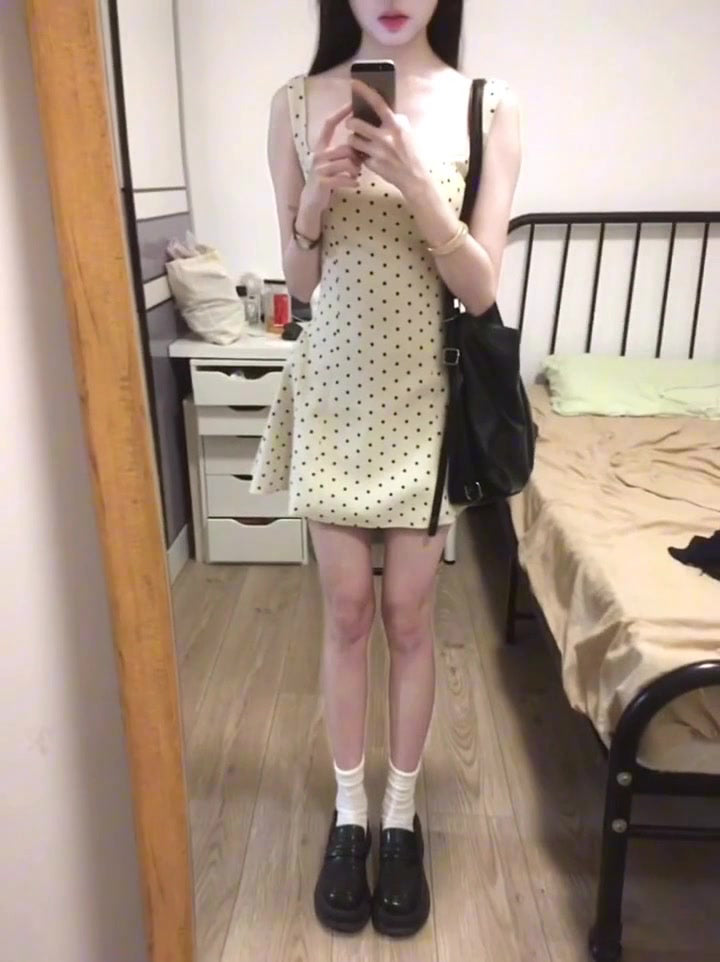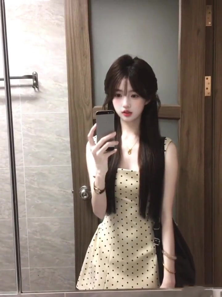 Gentle temperament polka dot suspender dress beautiful waist dress puffy skirt R0638