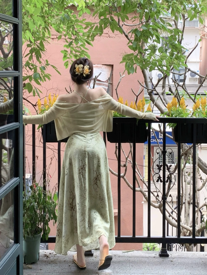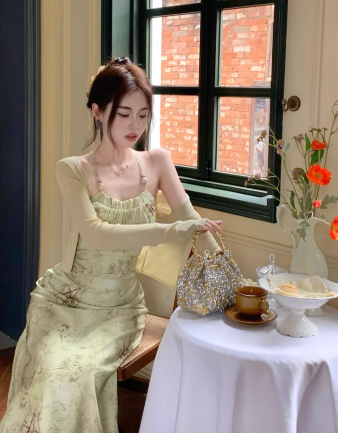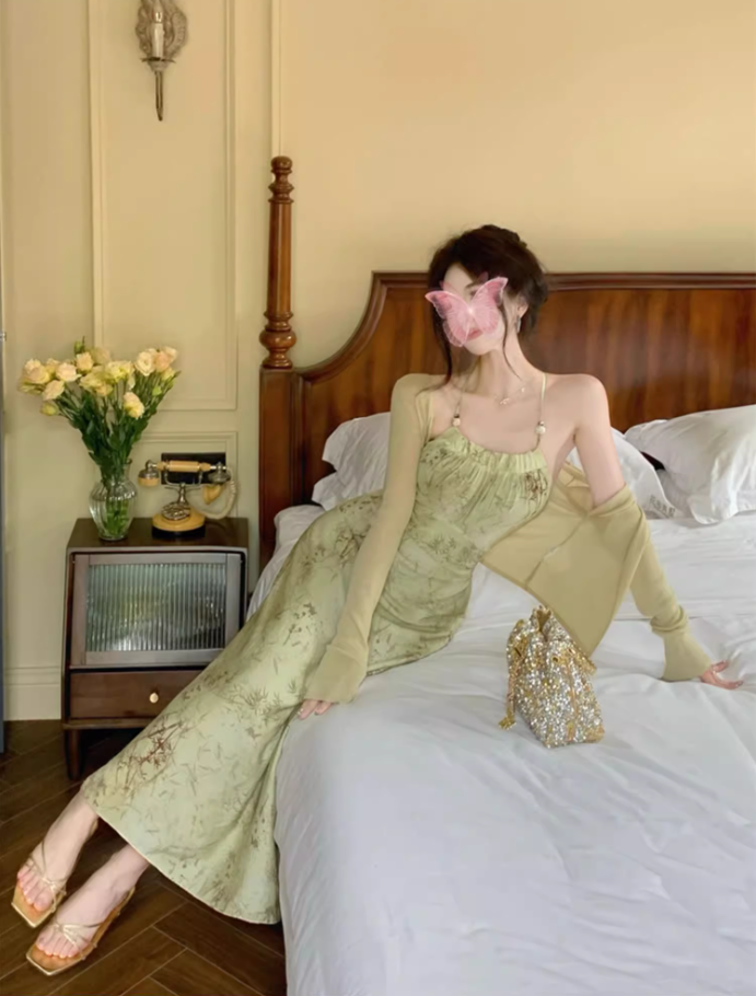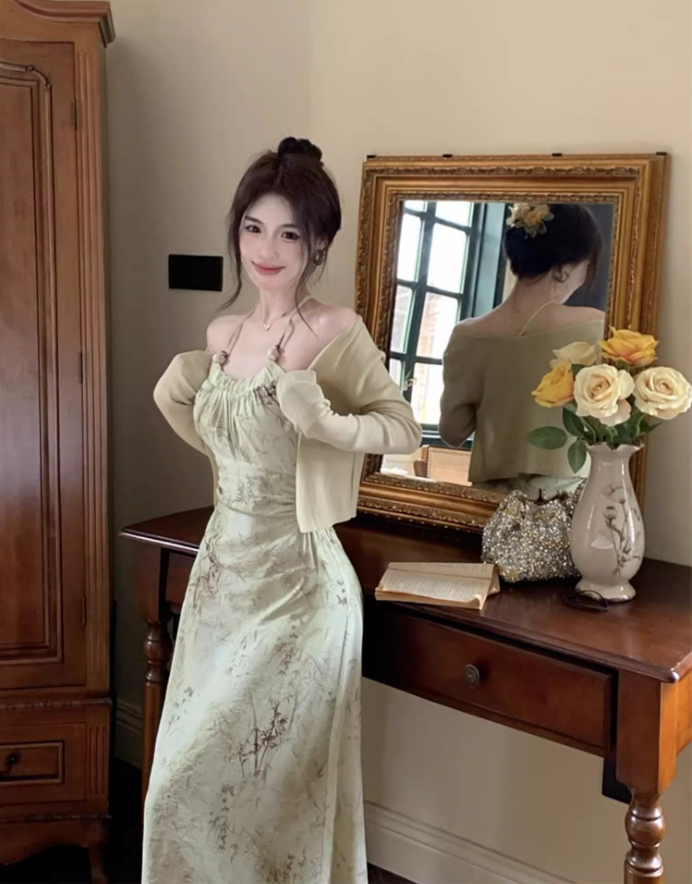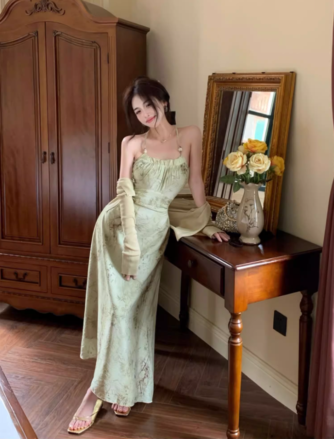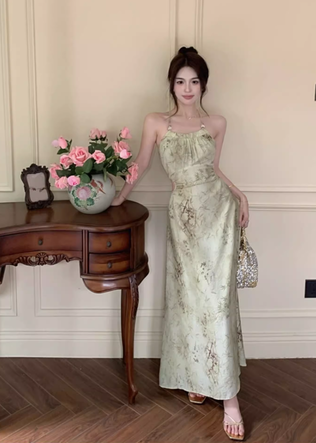 Halter neck suspender dress 2025 sexy backless print gentle waist-revealing long skirt R1476
