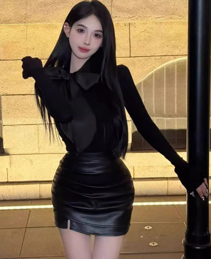 High-grade sense of the queen bow top 2025 large size sexy hip leather skirt suit R1401