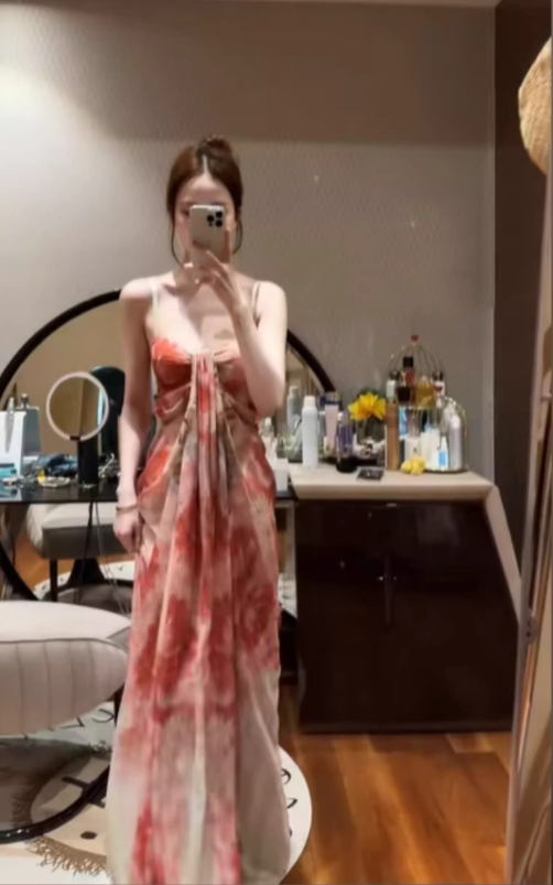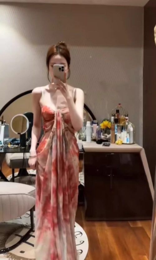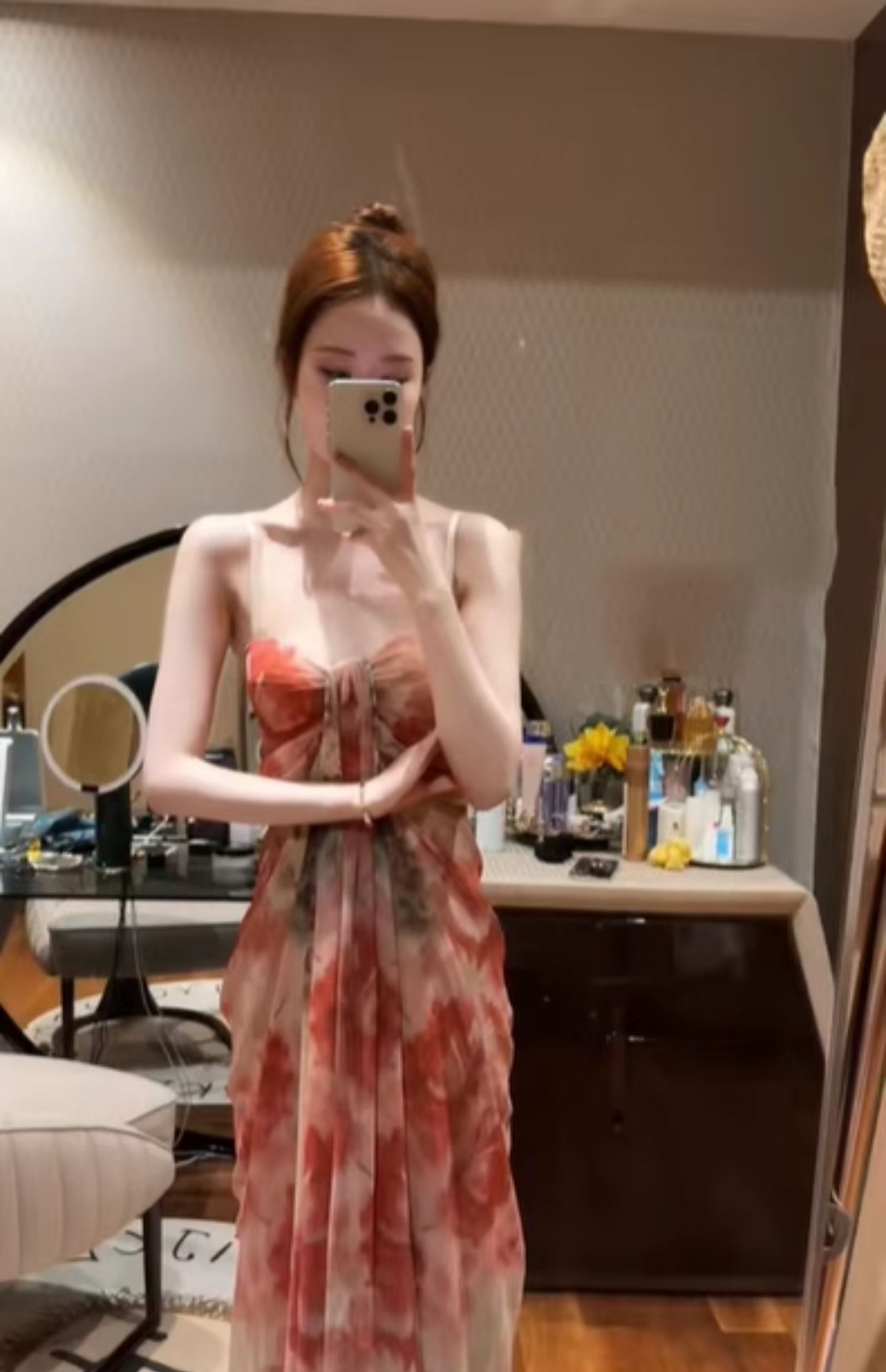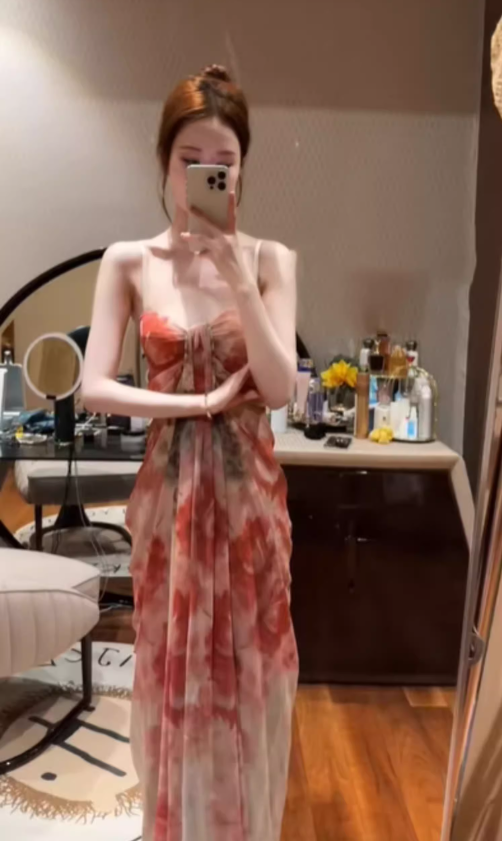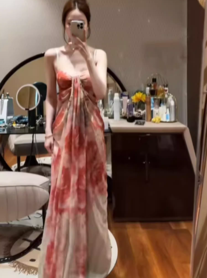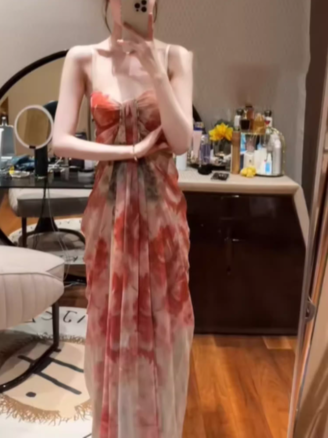 Holiday style dress niche style skirt v-neck floral suspender skirt summer R0699