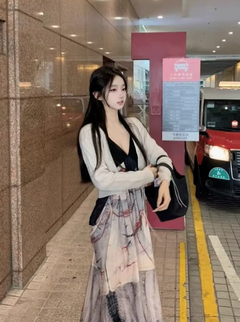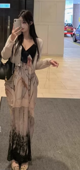 Ink print dress sexy backless holiday design sling sexy V-neck lazy skirt R1489