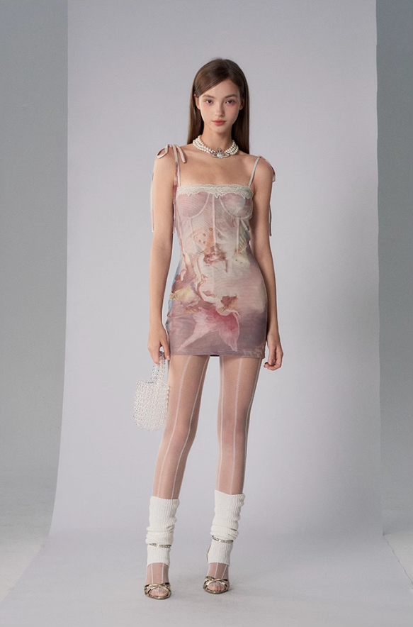 Lace fishbone print dress summer lace patchwork waist bag hip skirt R3334