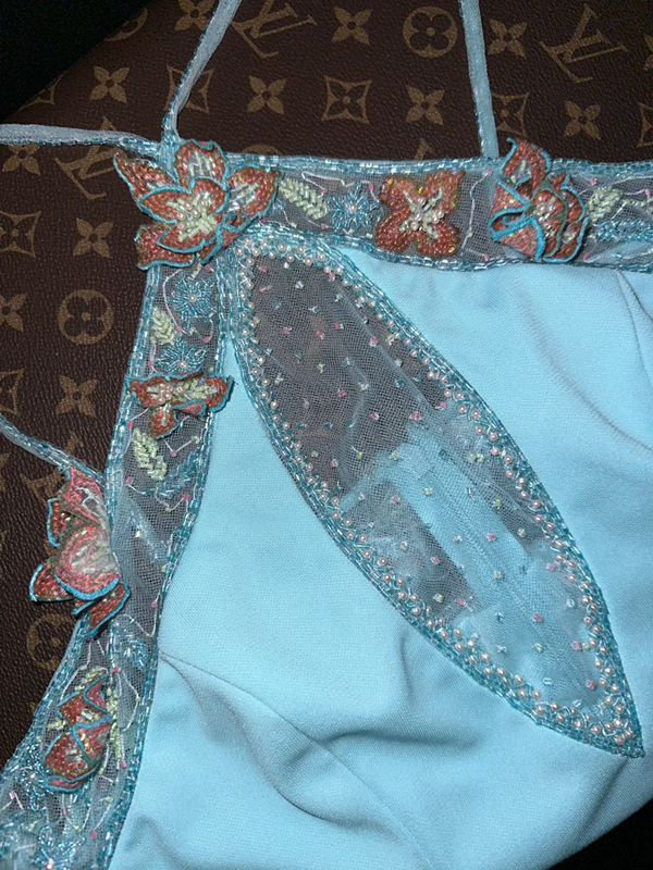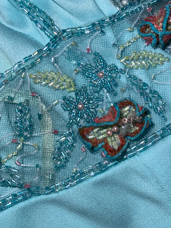 Light blue halter neckline with beaded details, fitted waist, elegant long ball gown R6903