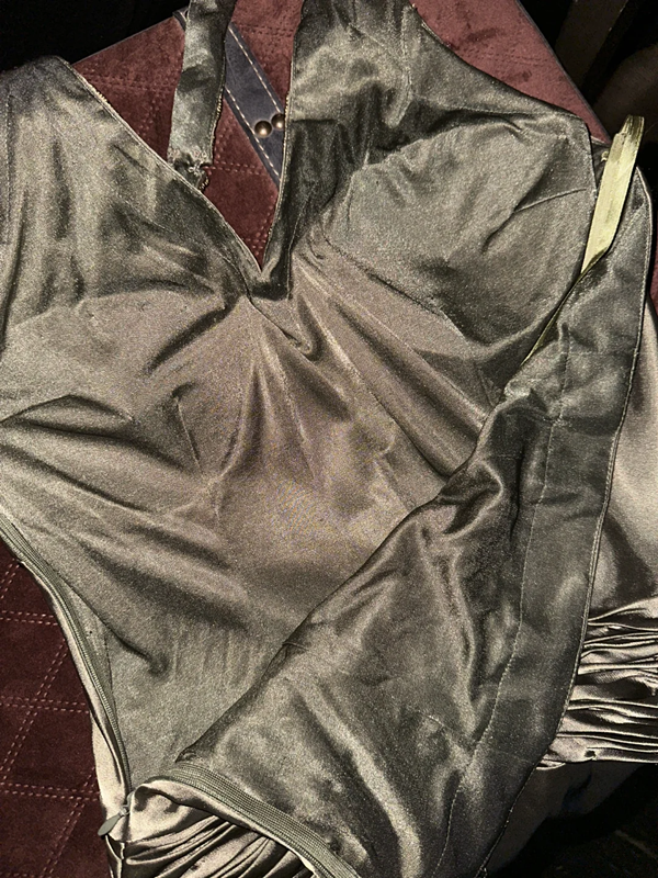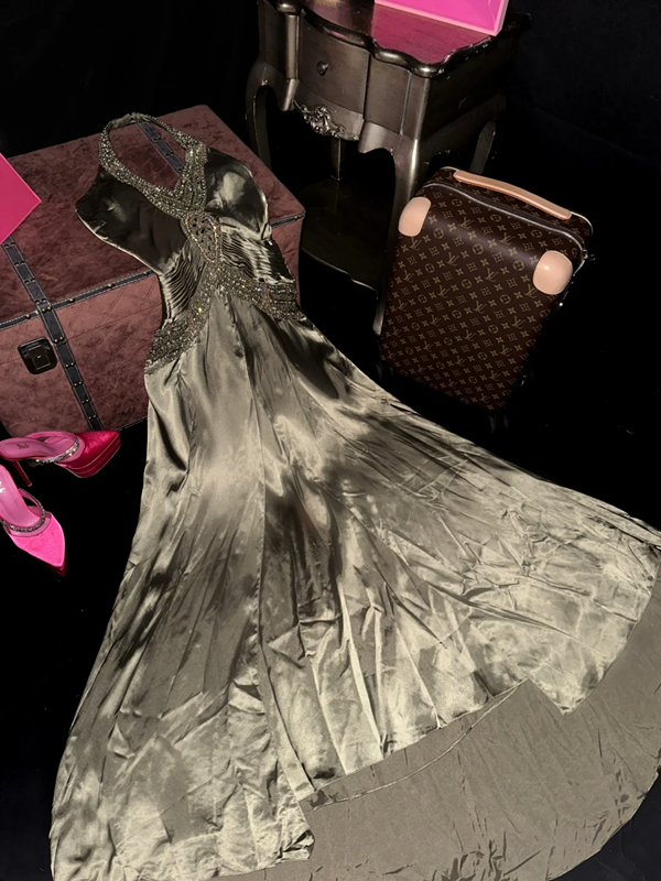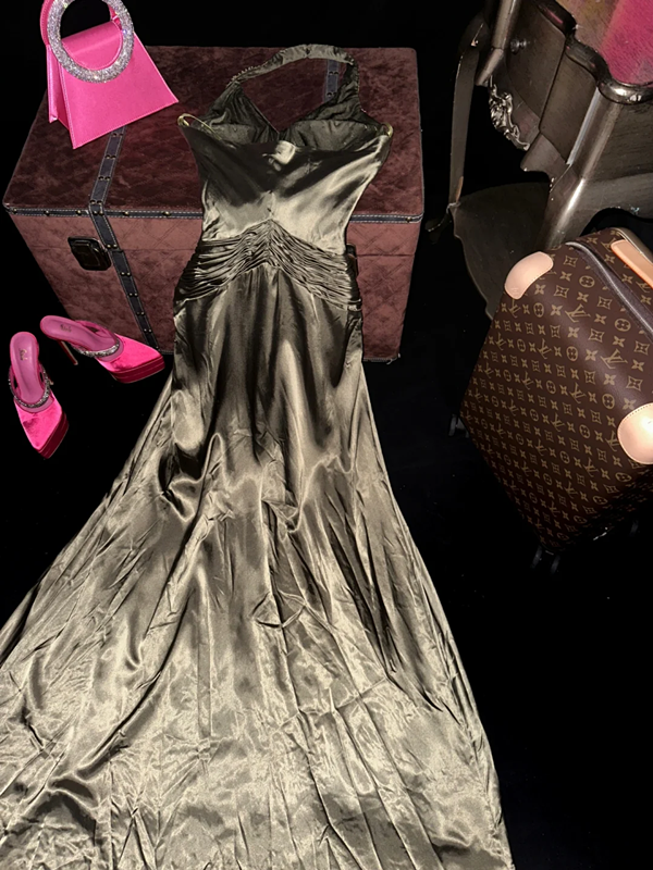 Light gray-green halter neck fitted waist slim-fit satin long ball gown R7037
