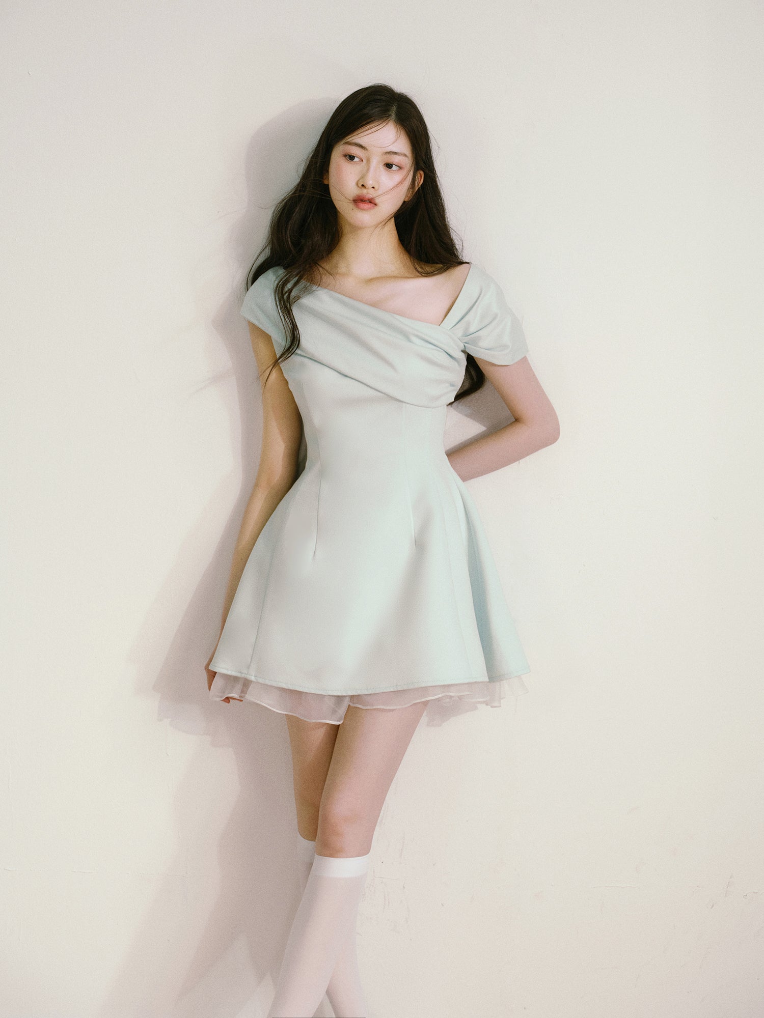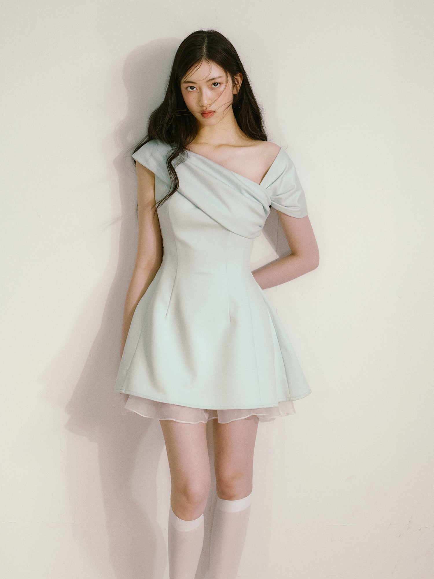 Mint green one-shoulder dress Qianjinfeng niche design unique beautiful waist skirt R5128
