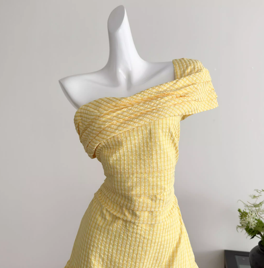 Off-shoulder yellow plaid bud texture A-line elastic waist dress R2065
