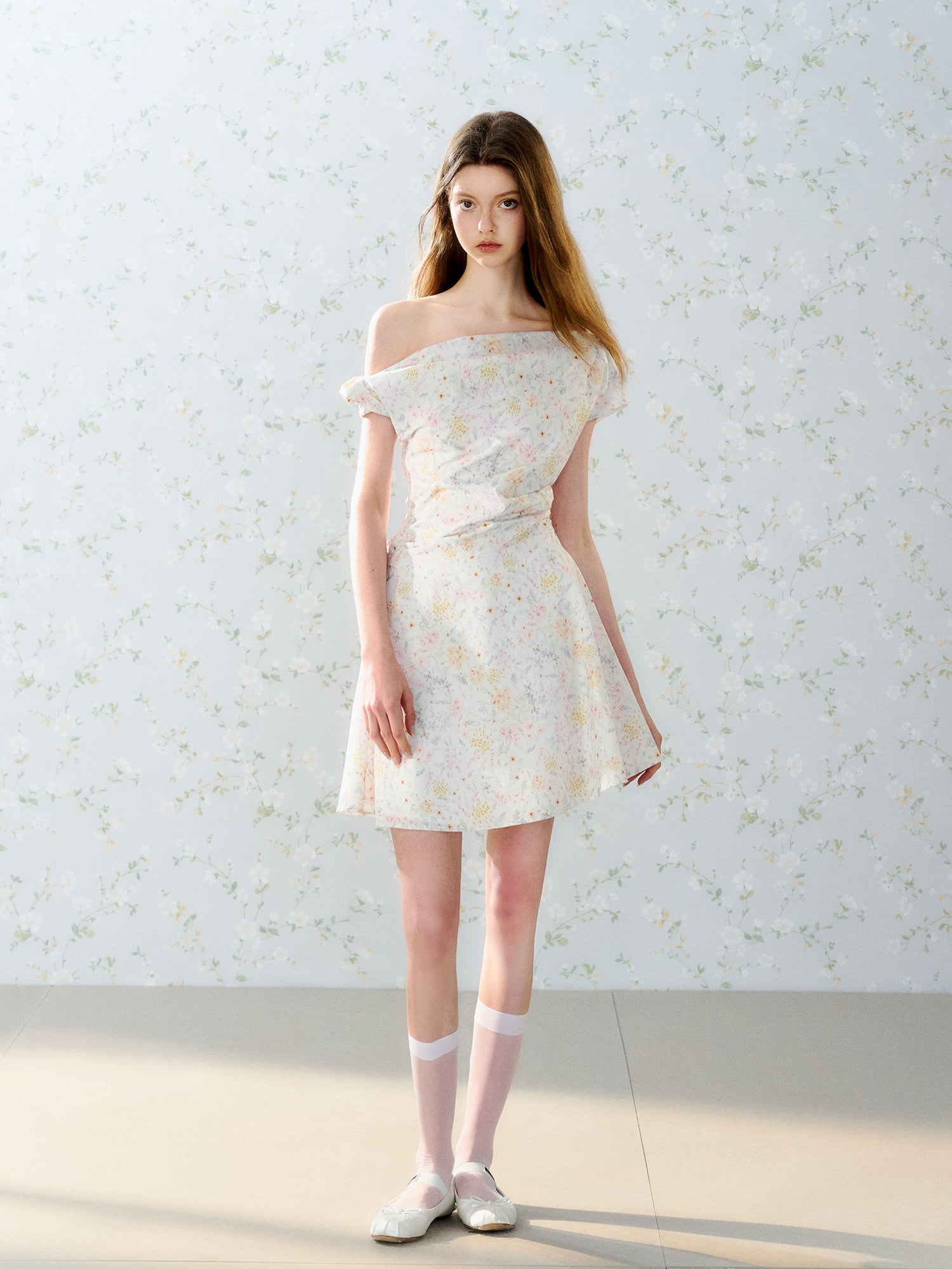 One-shoulder floral dress with asymmetrical twisted pleated waist R5206
