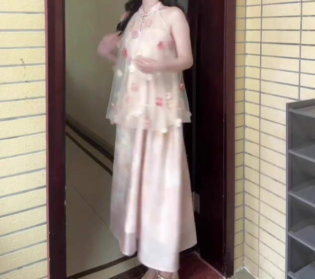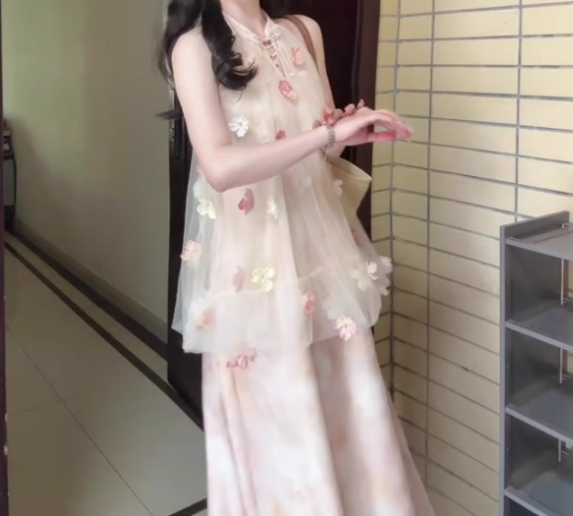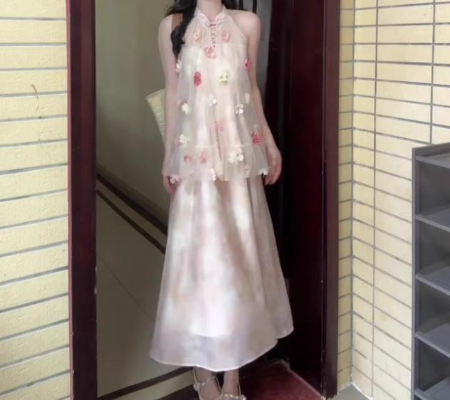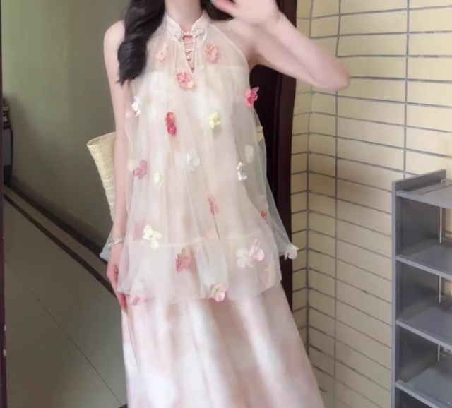 Pink buttoned mesh halter neck dress gentle temperament loose A-line long skirt R0751