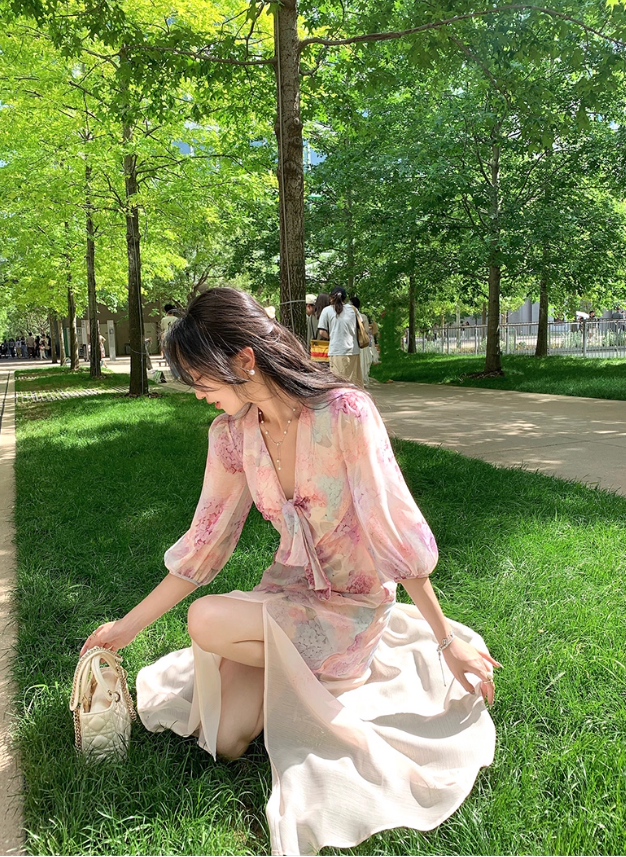 Pink chiffon printed dress for women summer new beautiful slit waist niche long skirt R4263
