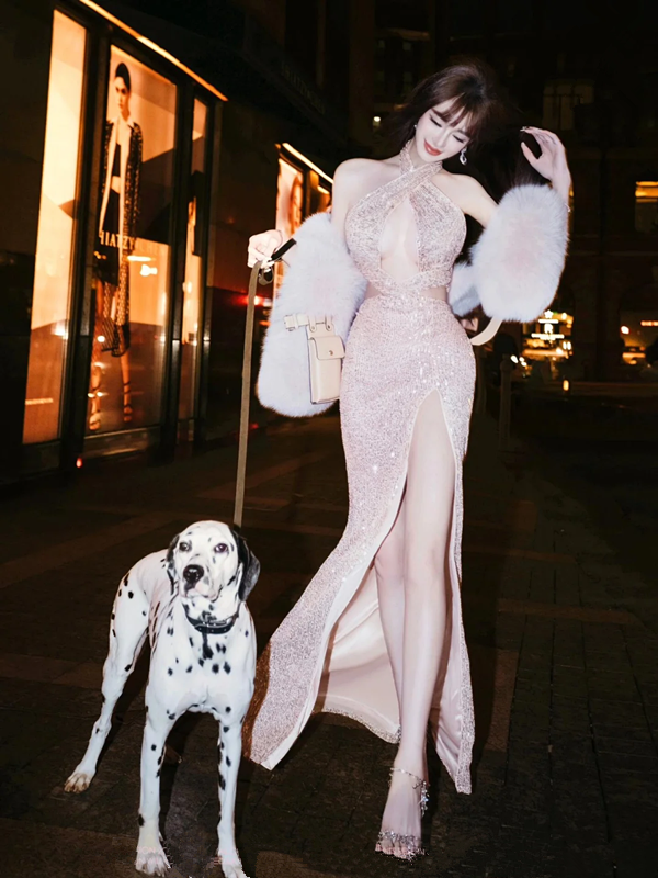 Pink Halter Neck Sequin-Embellished Cut-Out Waist Sexy High-Slit Floor-Length Prom Dress R7108