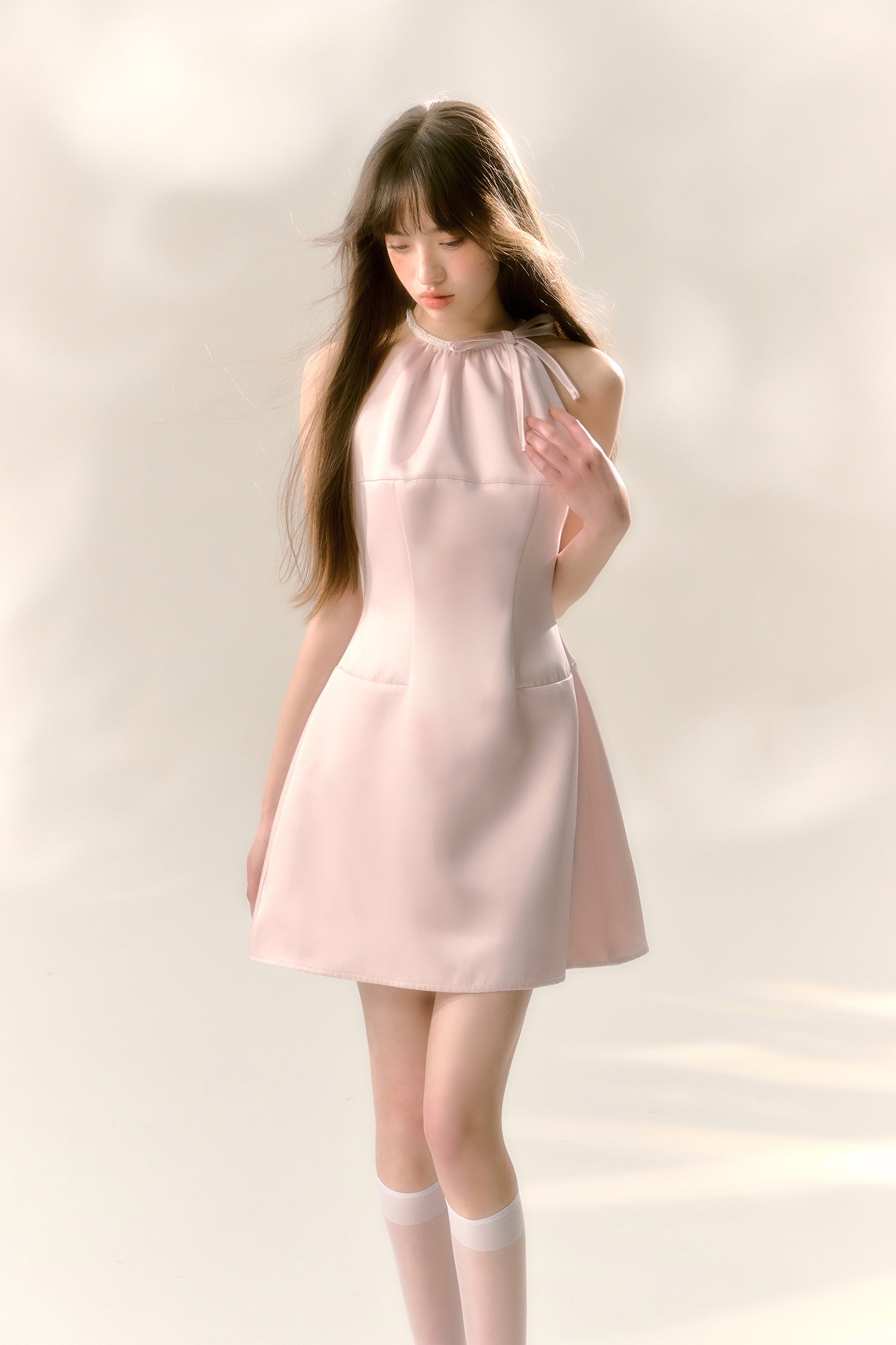 Pink satin glossy halter neck dress with bow waist A-line sleeveless short skirt R5130