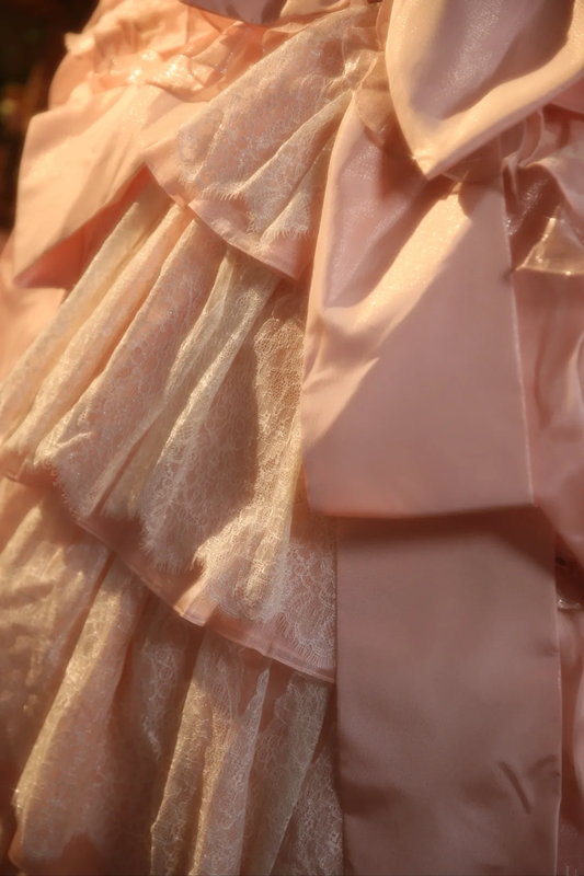 Pink strapless ball gown with a cinched waist and a voluminous tiered cake skirt; bridal gown R7282