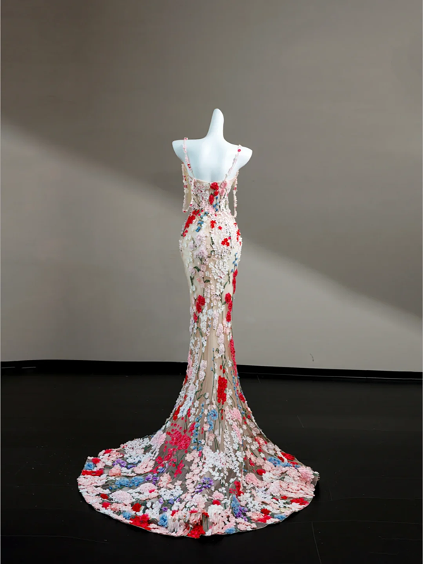 Pink suspender three-dimensional small flower waist slim hip long skirt, prom dress R5639