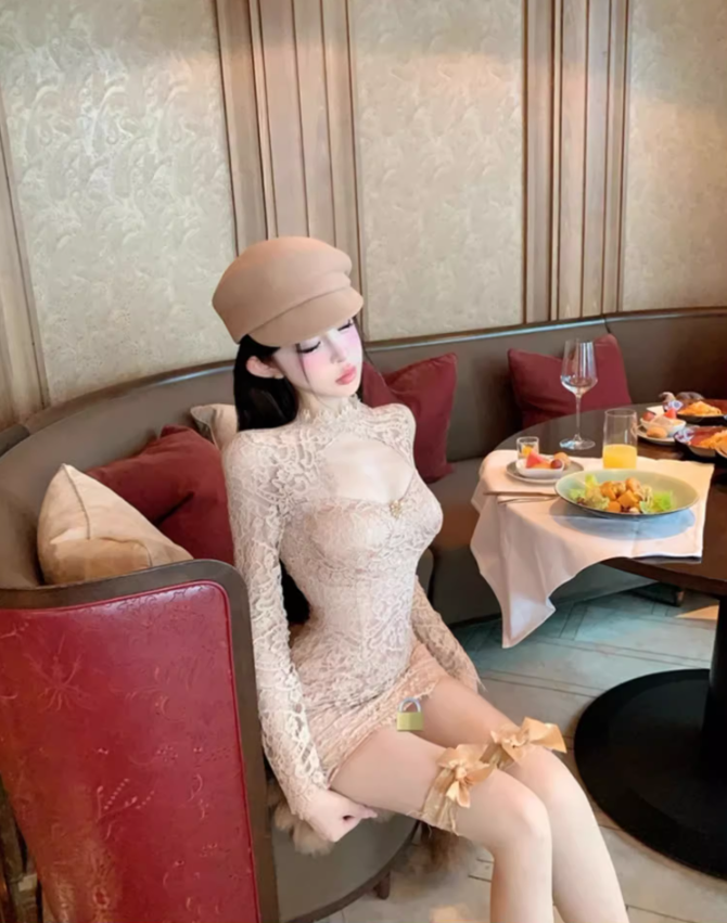 Pure desire hot girl lace hollow long sleeve dress 2025 waist hip short skirt R1174