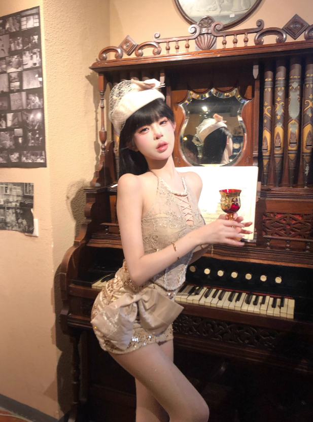 Pure desire hot girl lace strap halter neck top 2025 heavy sequin skirt suit R1406