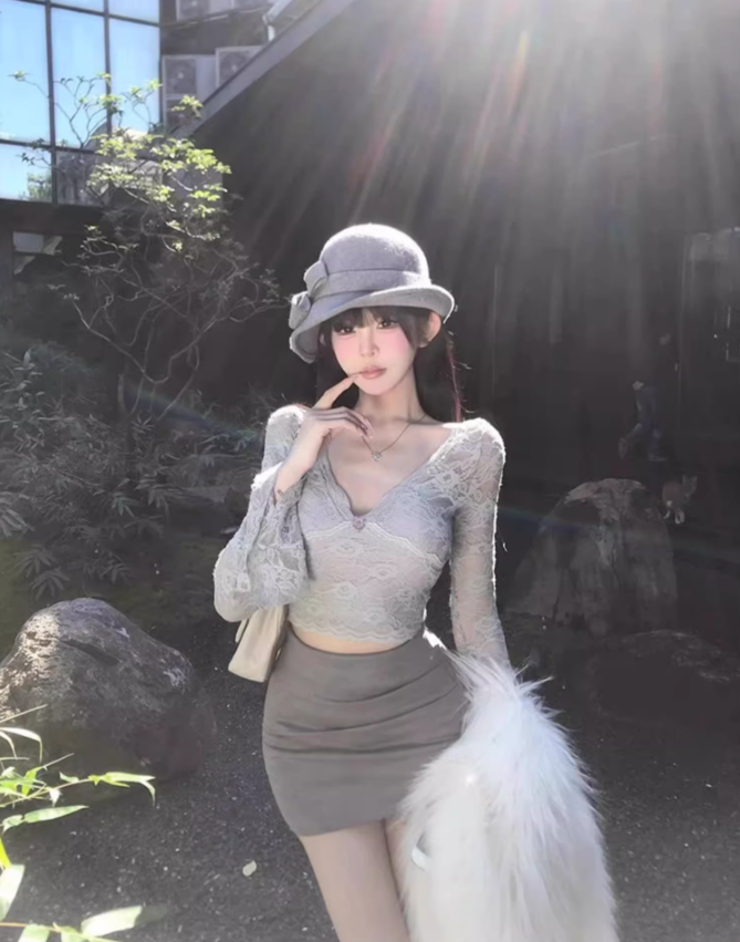 Pure desire hot girl V-neck lace bottoming top 2025 irregular hip skirt suit R1149