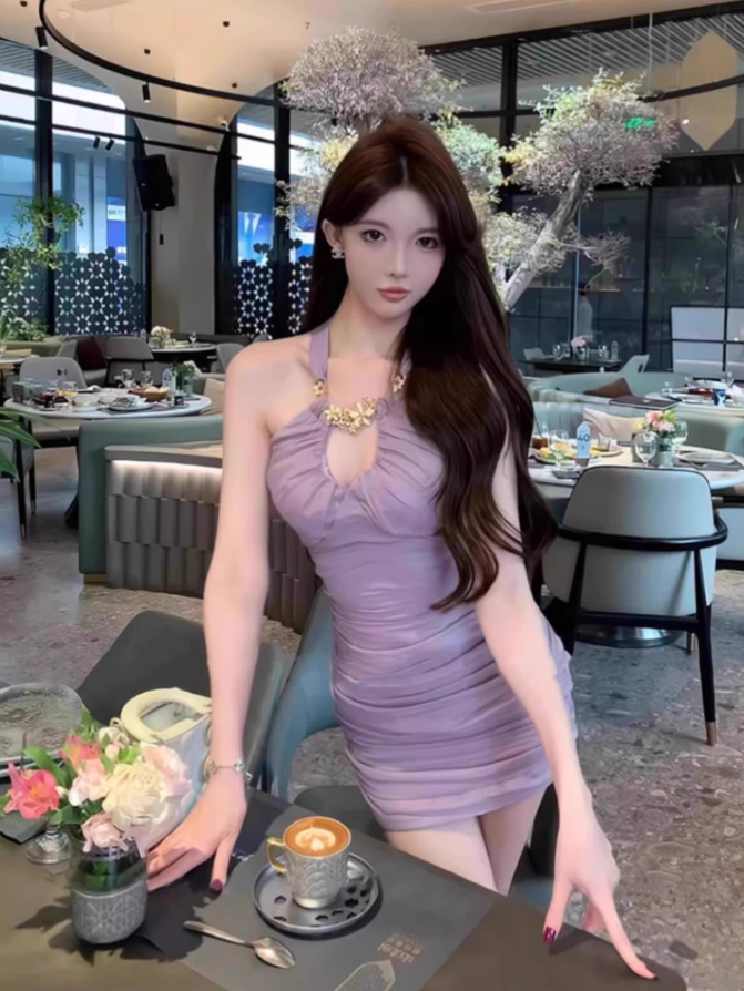 Pure desire style metal buckle halter neck dress 2025 pleated waist hip skirt R1191