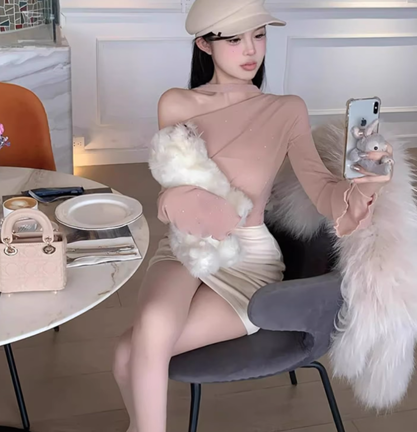 Pure desire style off-shoulder long-sleeved top 2025 plus size hot girl hip skirt suit R1170