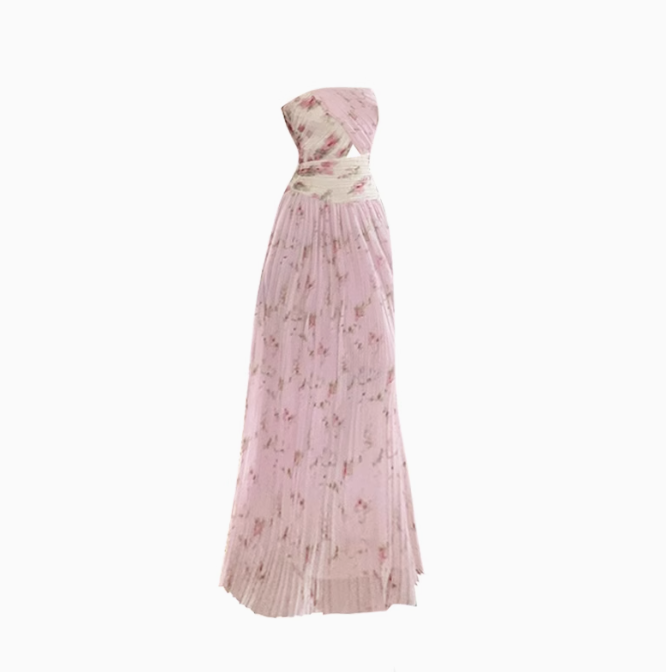 Pure desire style tube top hollow dress 2025 pleated floral holiday long dress R1411