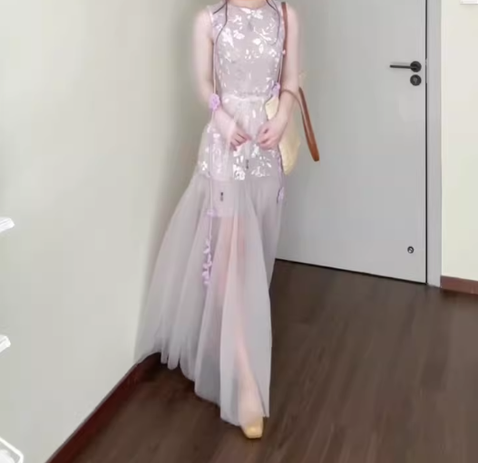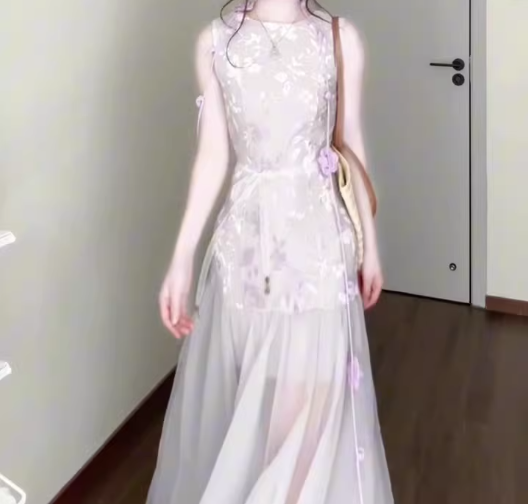 Purple mesh jacquard vest dress temperament waist A-line long skirt R0733