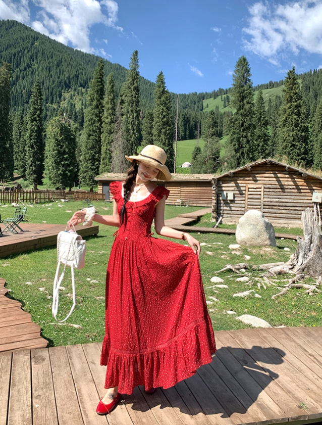 Red polka dot lace cinched waist small flying sleeve dress for women's summer French dress R4784