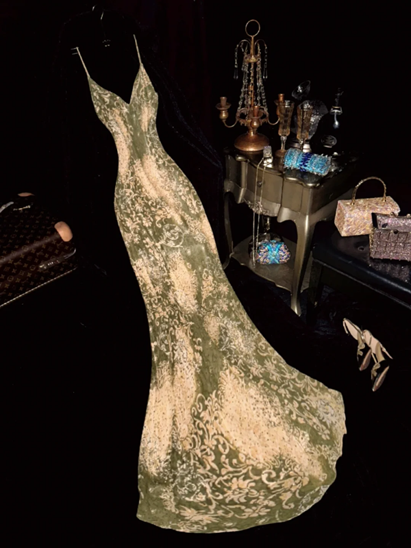 Retro green halter-neck printed fitted long ball gown R6880