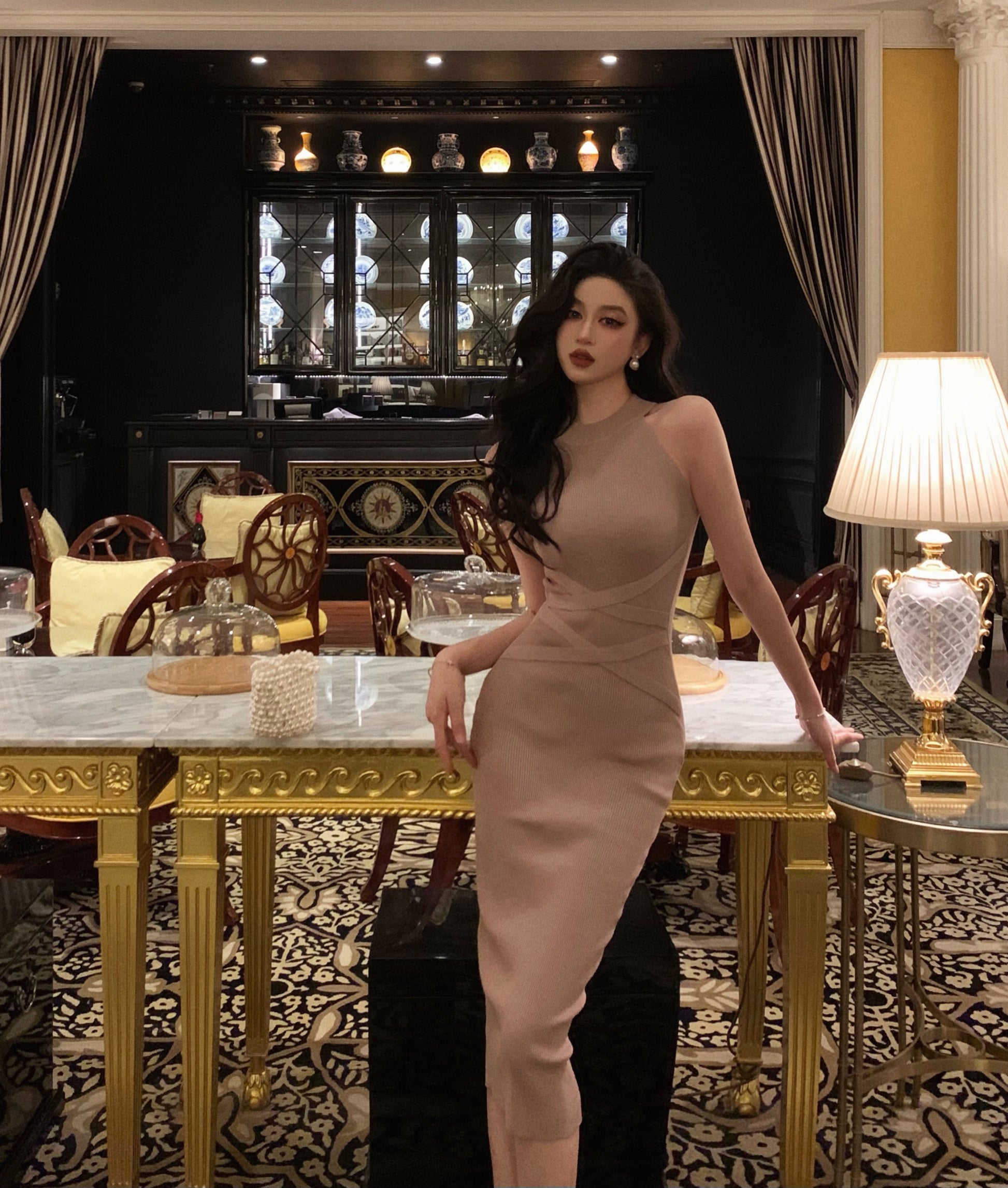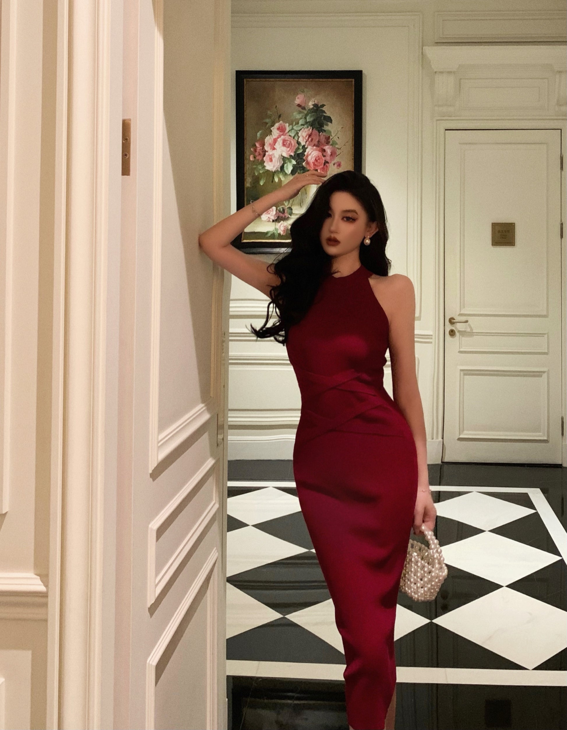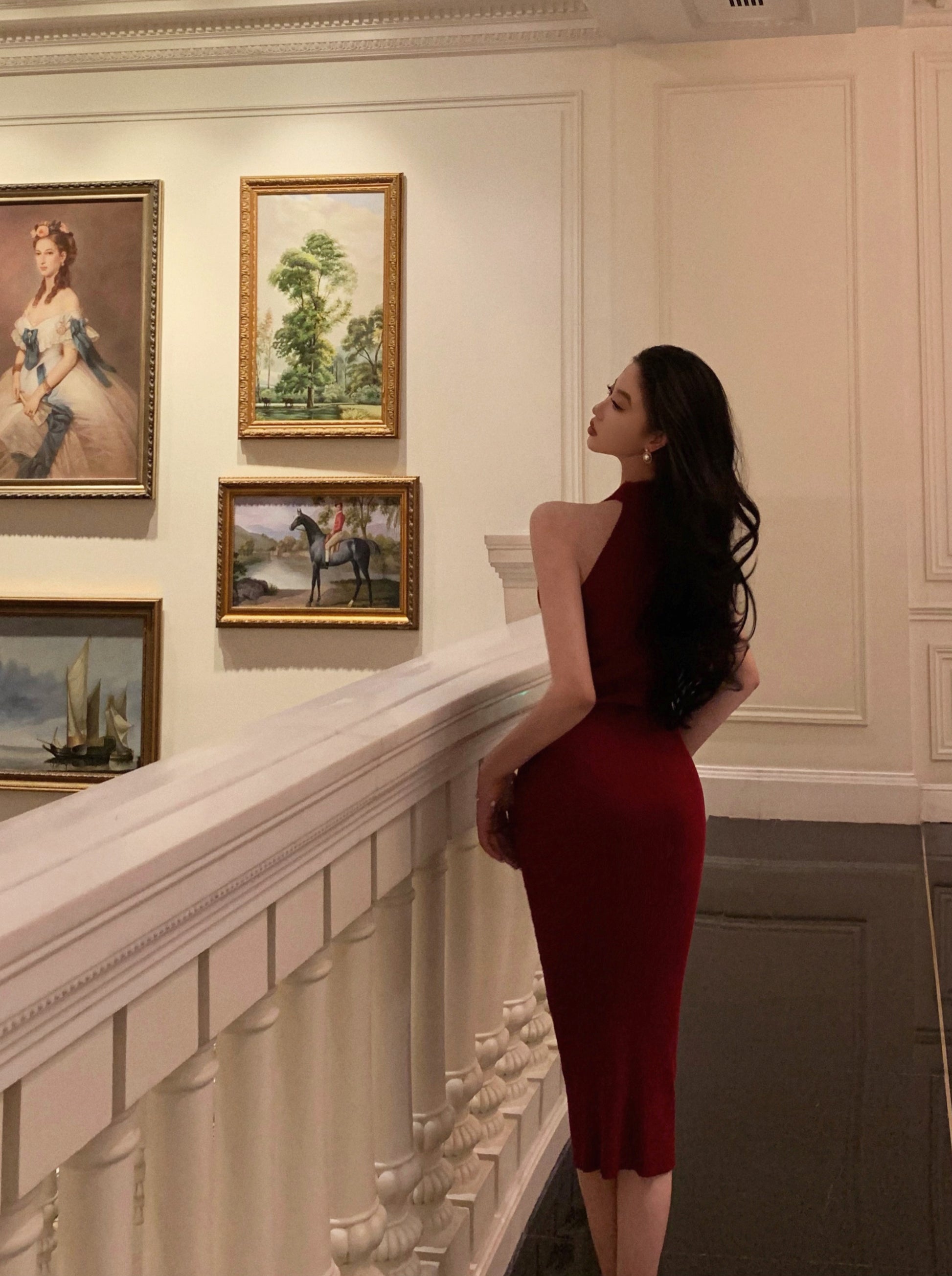 Retro halter neck suspender dress sleeveless lace-up knitted slim fit sexy hip skirt R1491