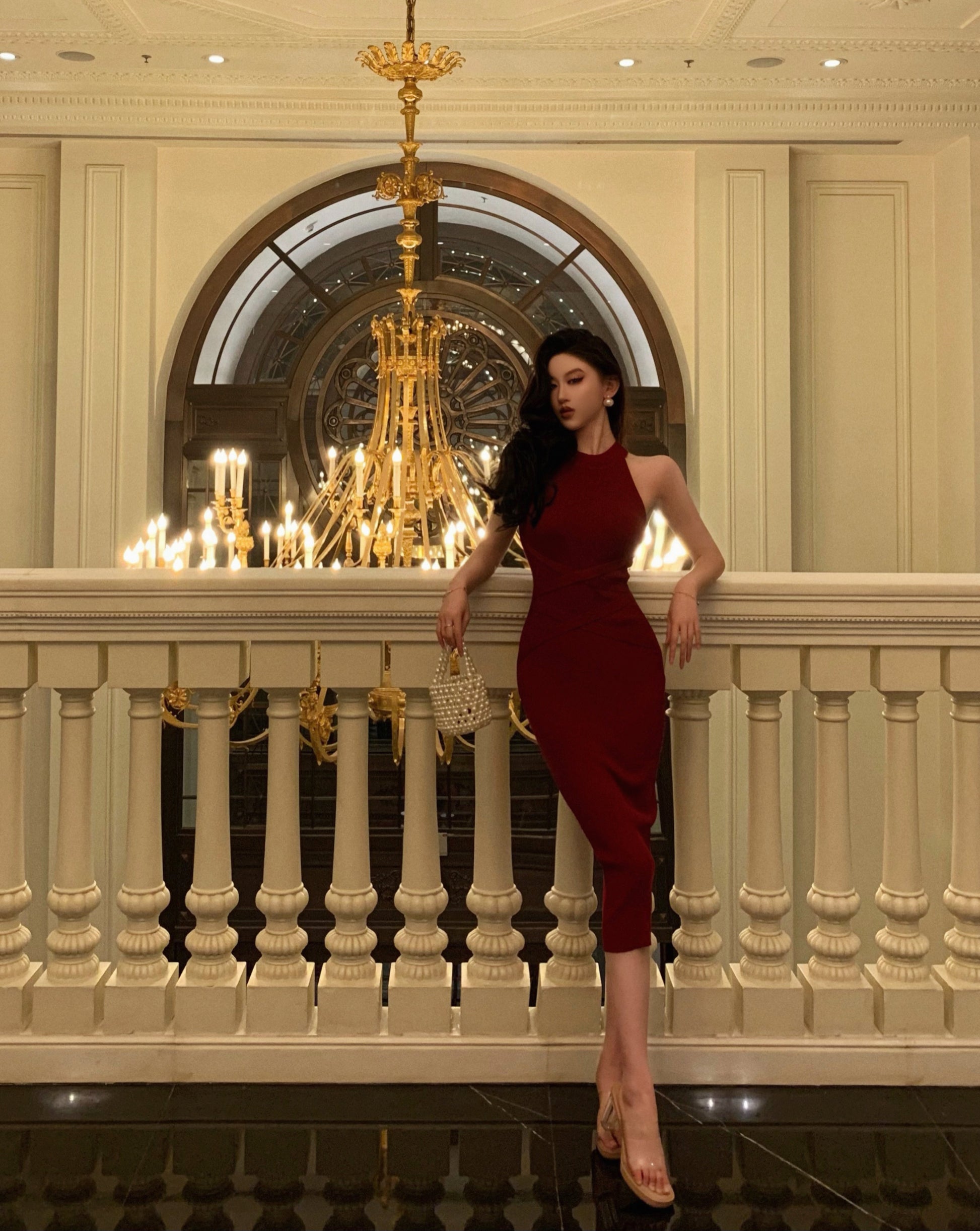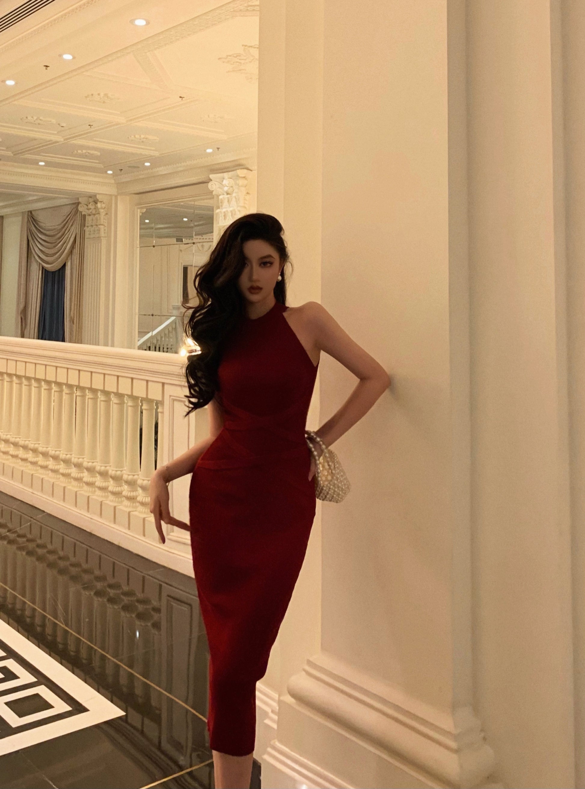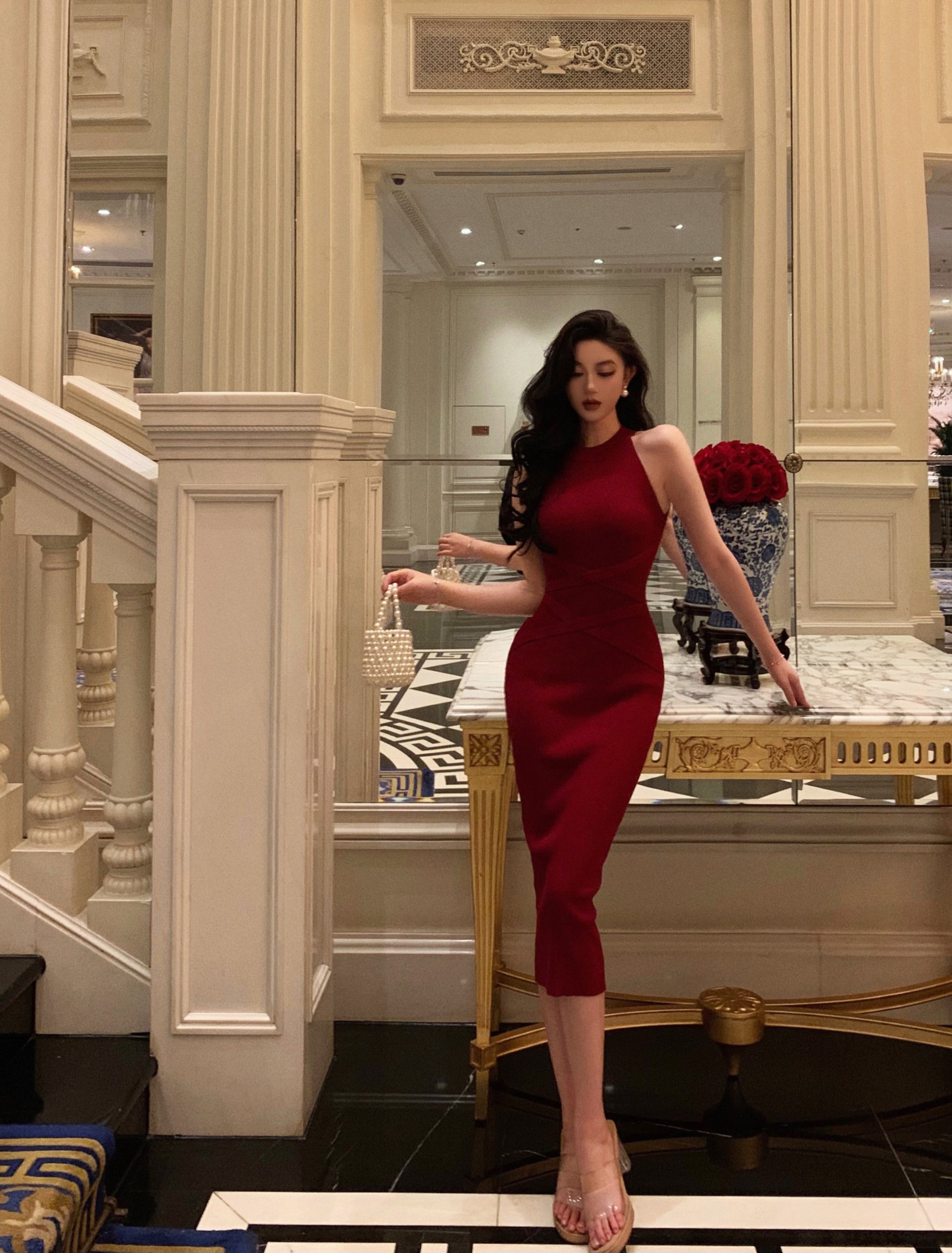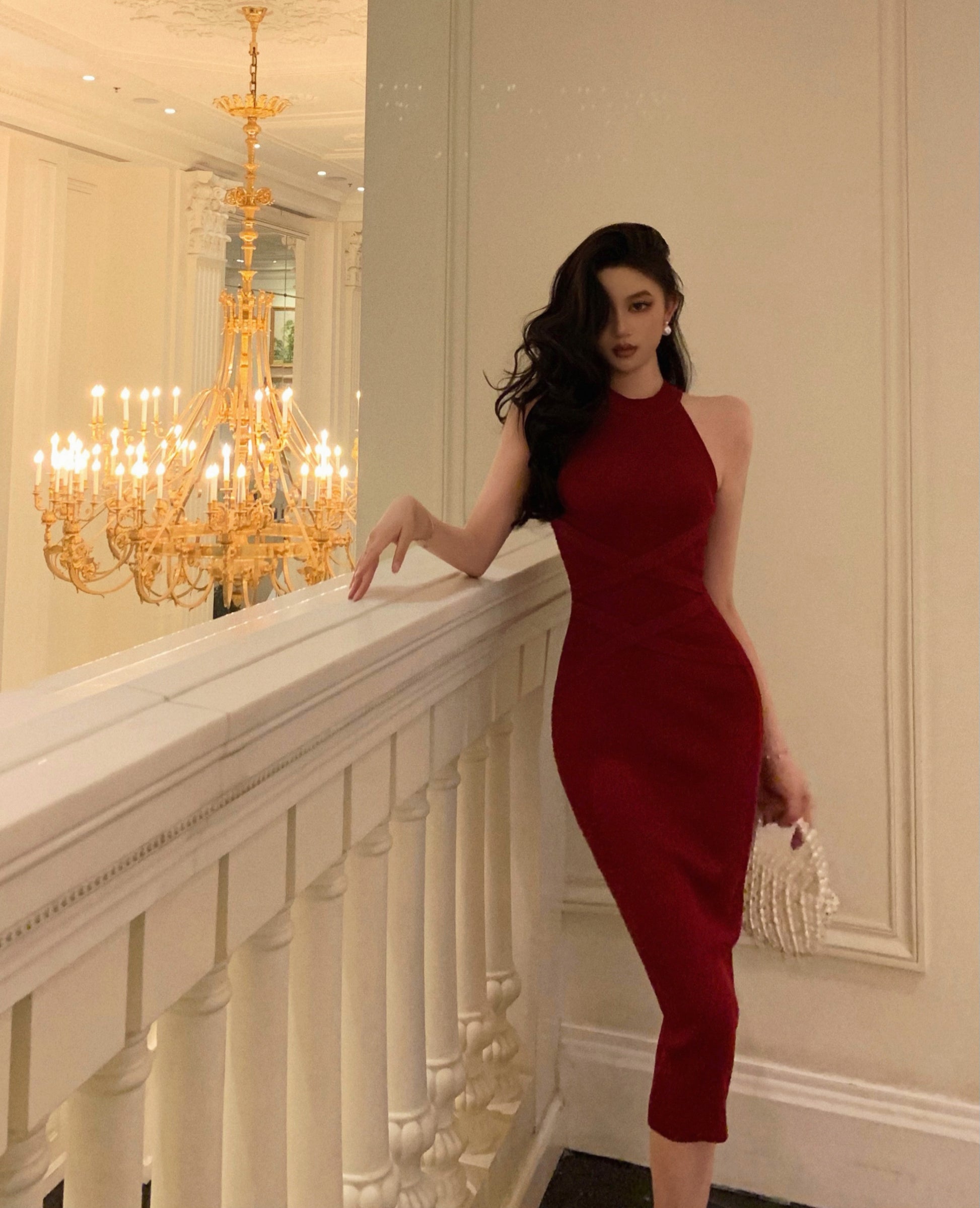 Retro halter neck suspender dress sleeveless lace-up knitted slim fit sexy hip skirt R1491
