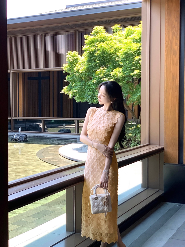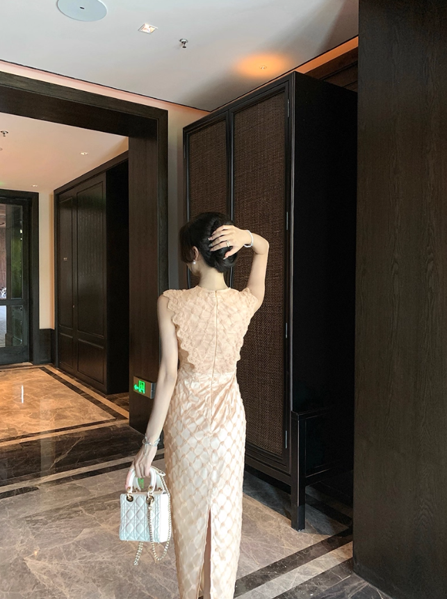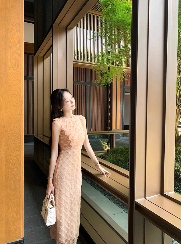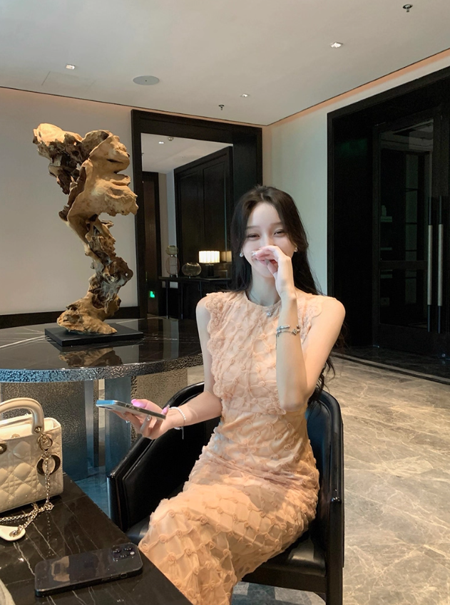 Retro Heavy Khaki Sleeveless Three-Dimensional Decorative Dress for Women R4257