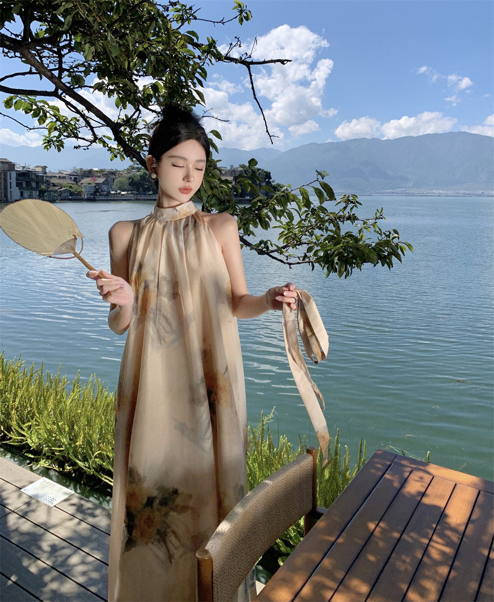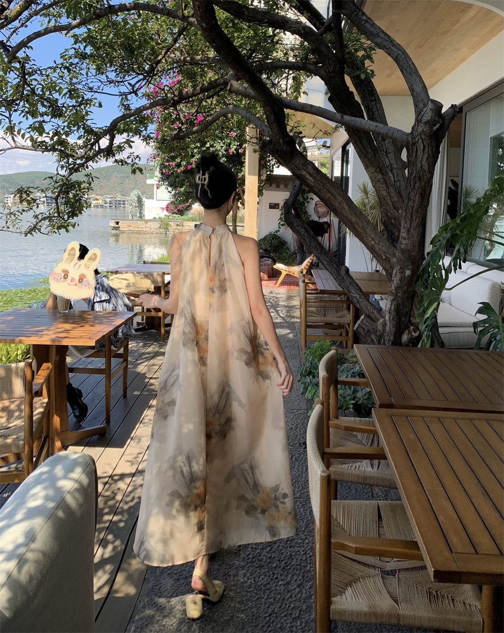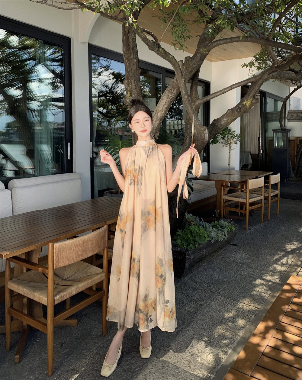 Retro high-end backless sexy halter neck dress waist temperament holiday long dress R1435