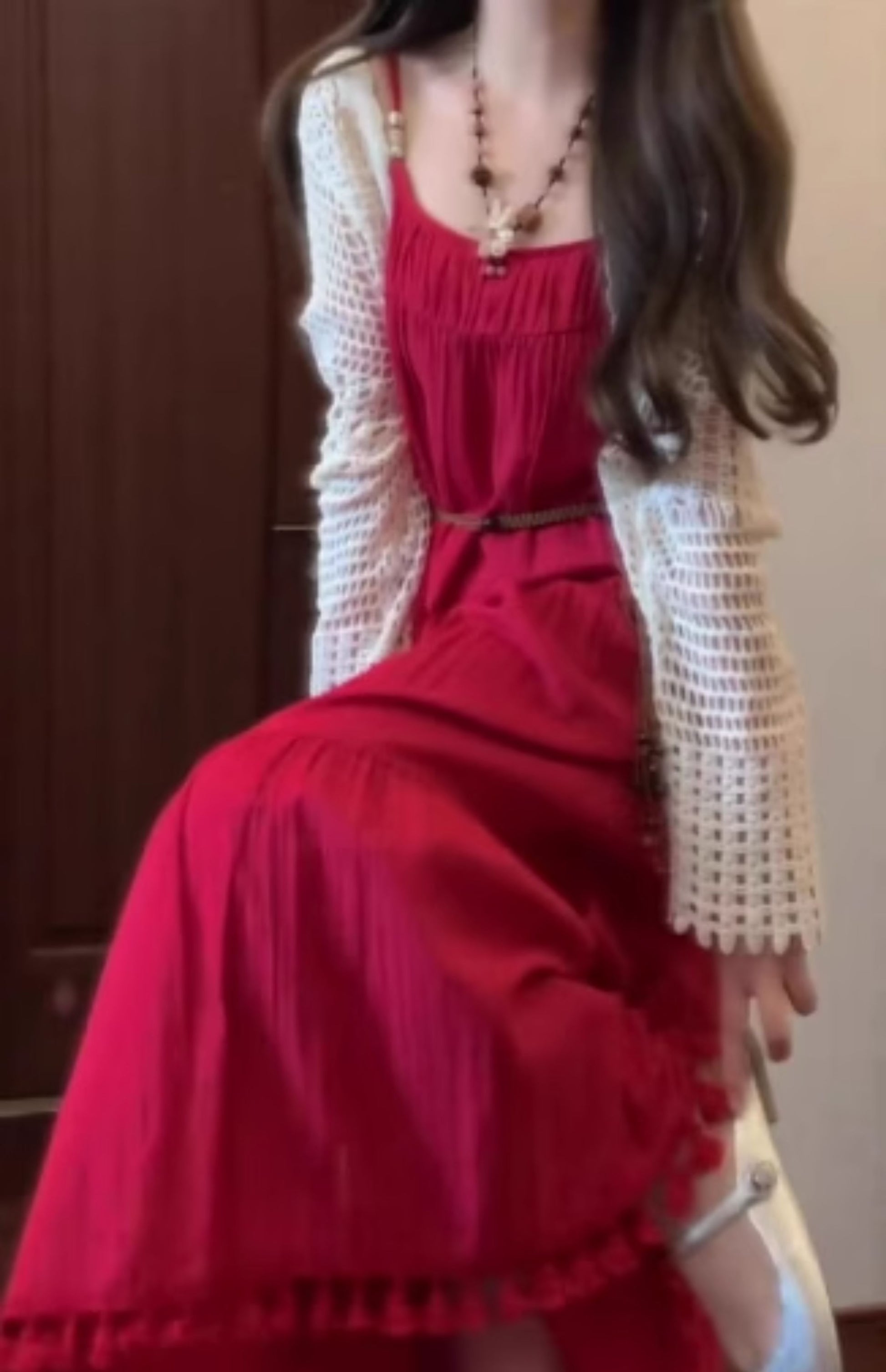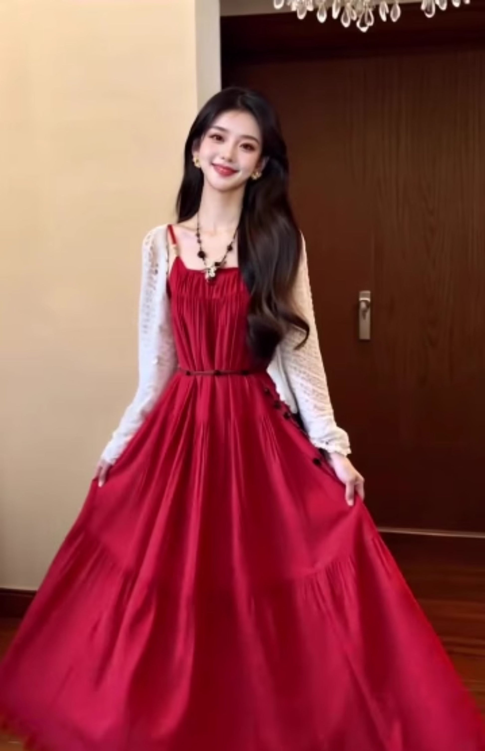 Retro red suspender dress holiday style temperament waist A-line long skirt R0682