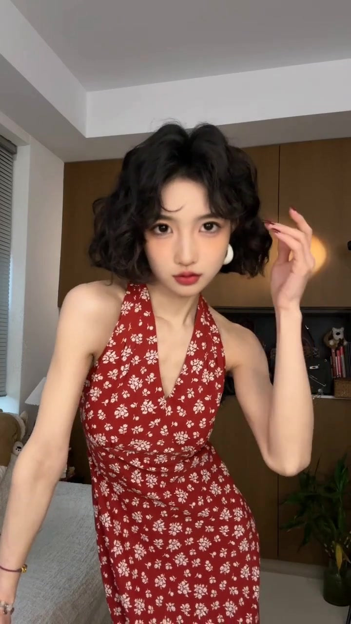 Retro red v-neck floral halter dress with waist and backless beautiful temperament long dress R0698