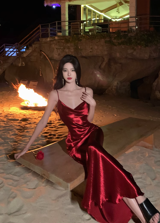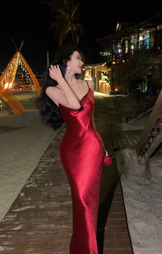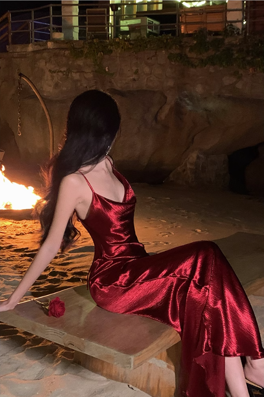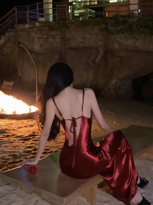 Retro suspenders red acetate swing collar hip-wrapped backless slim holiday inner skirt R1432