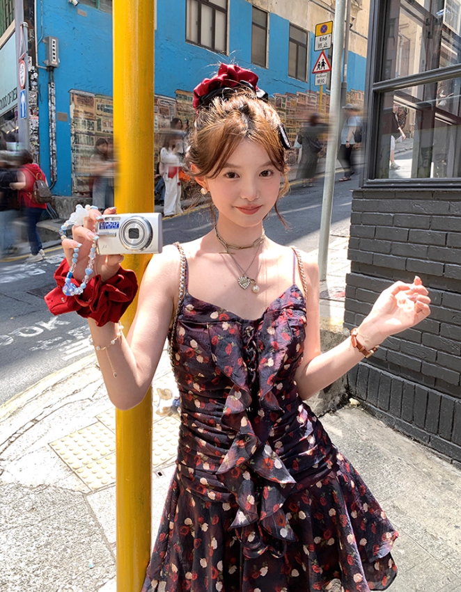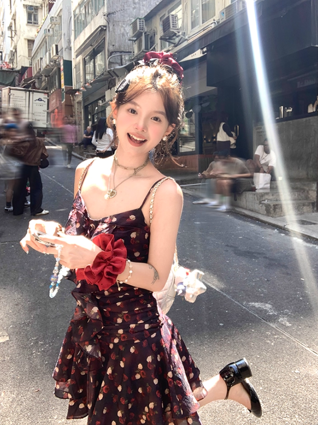Ruffled Romantic Rose Suspender Dress French Retro Temperament Dress R4988