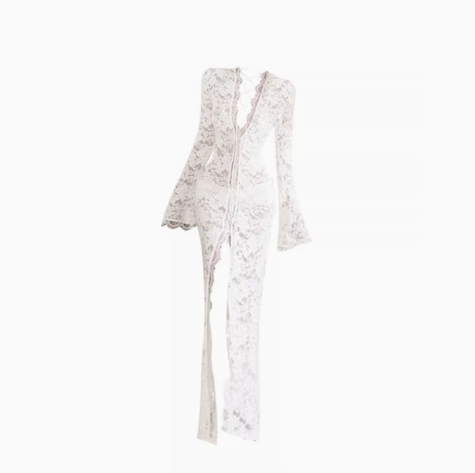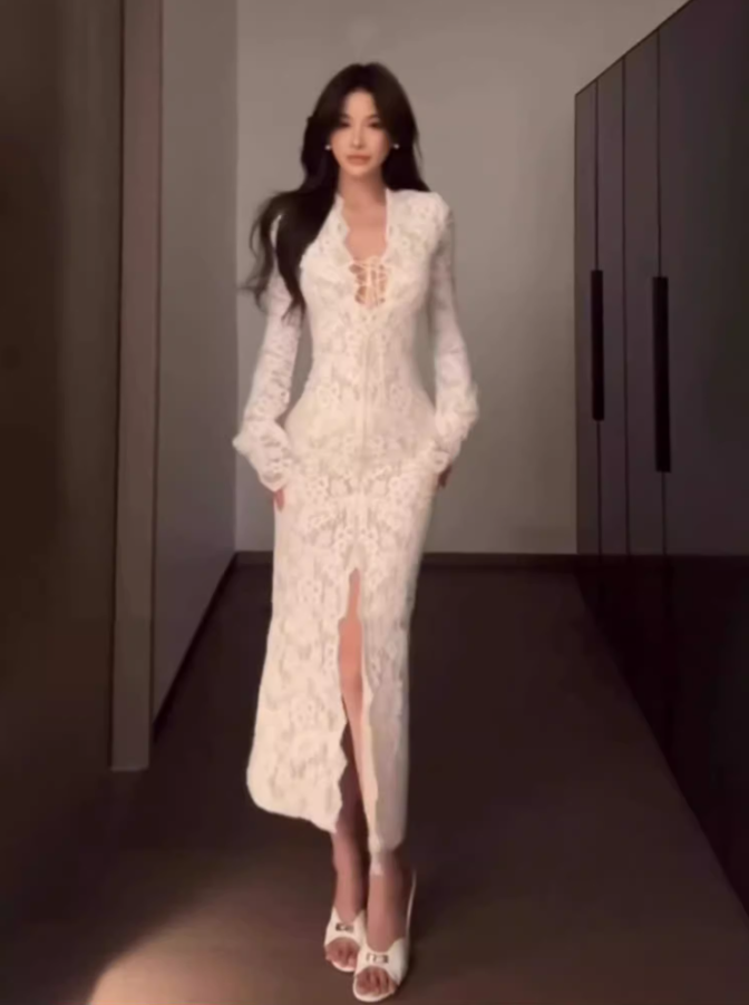 Sexy hot girl lace strap V-neck dress 2025 waist-hugging hip-wrapped slit long skirt R1205
