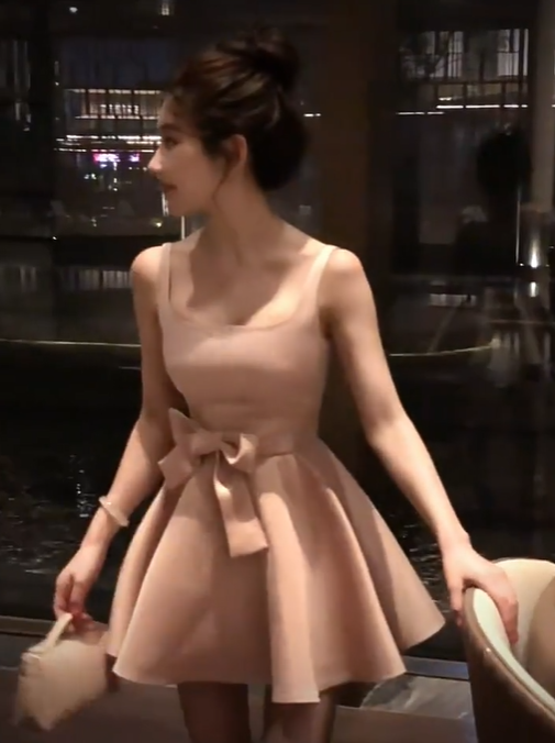 Slightly plump bow suspender dress for women French style waist birthday dress R3140