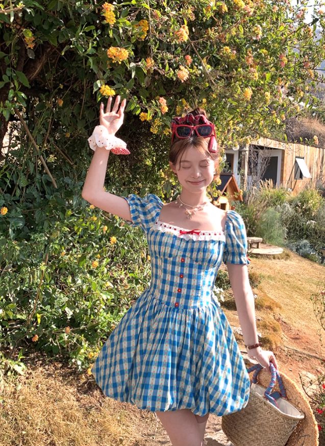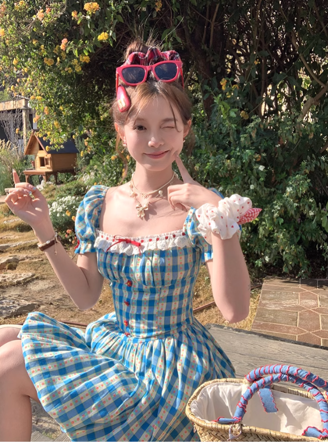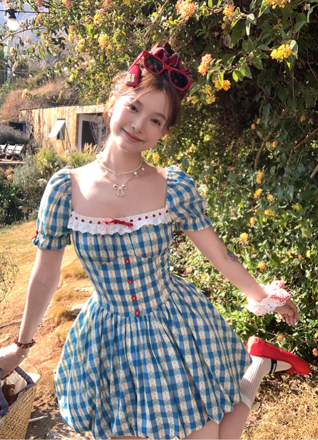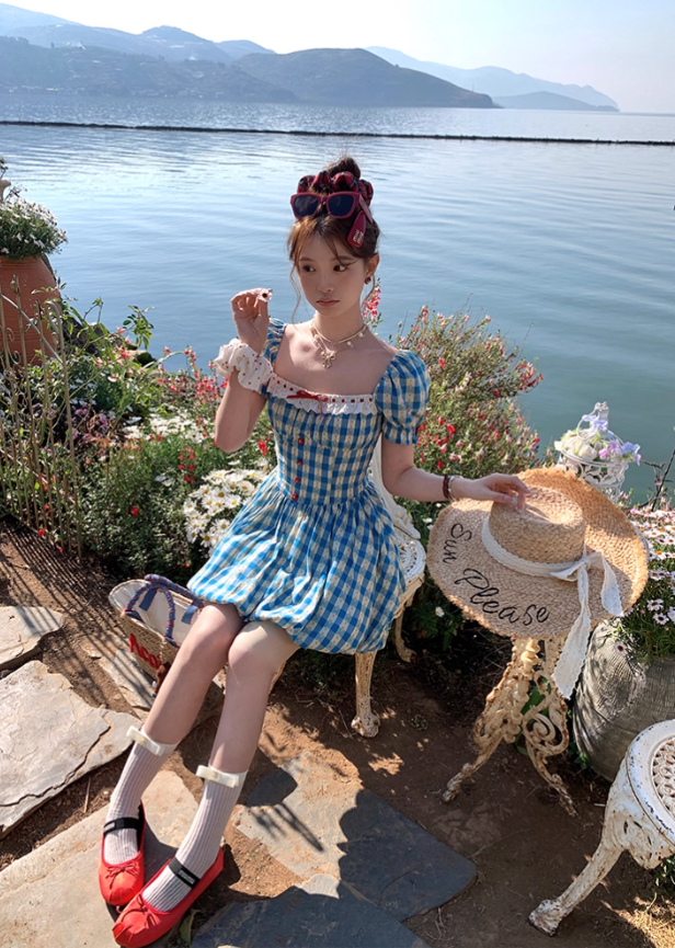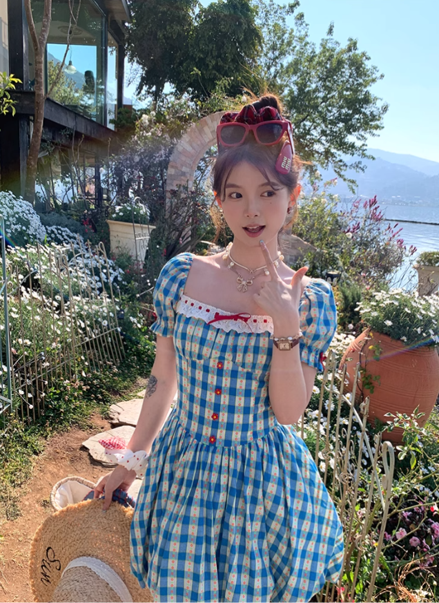 Square collar plaid waist short sleeve dress women's summer French style skirt R4826