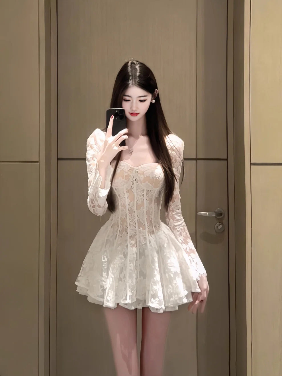 Square collar white lace puff sleeve dress gentle temperament pure waist skirt R0633