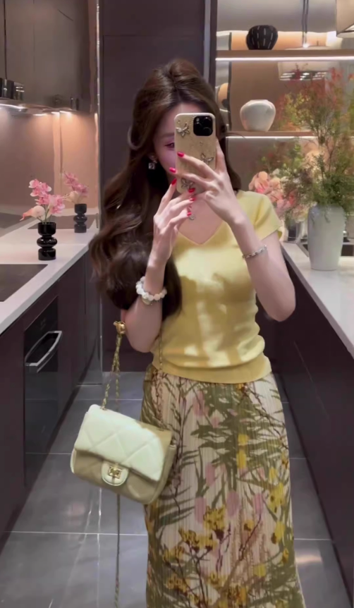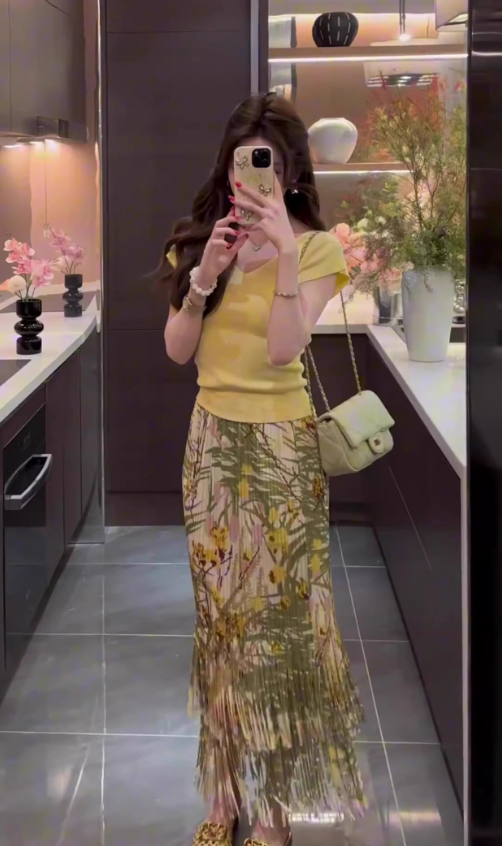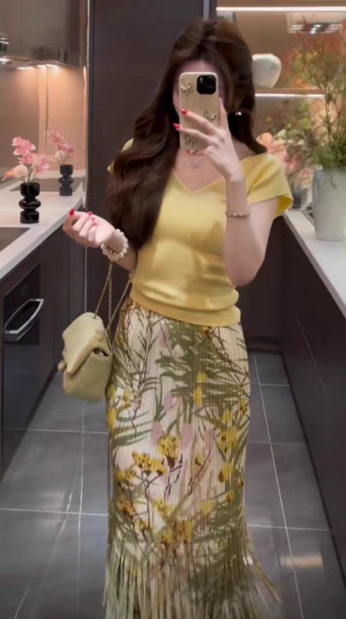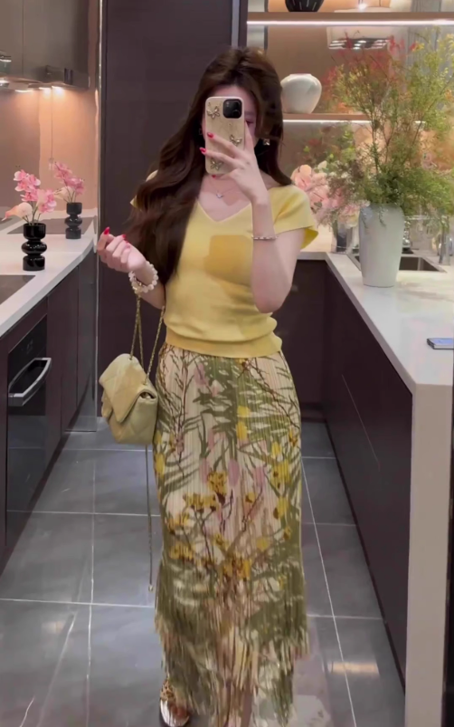 The queen is wearing a beautiful yellow short-sleeved T-shirt and floral skirt on vacation R0900
