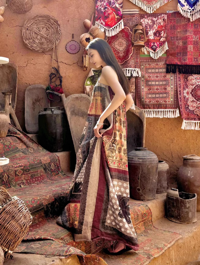 Travel wear retro ethnic style Bohemian suspender dress seaside beach dress R1623