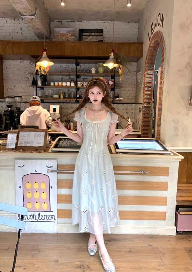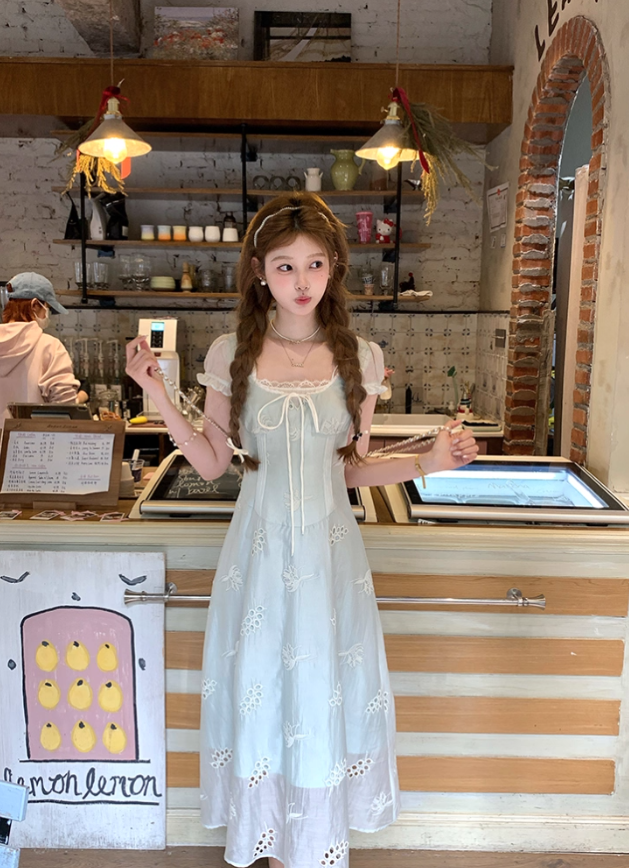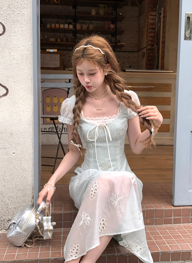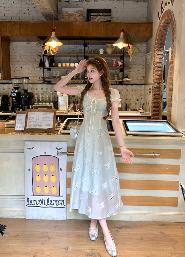 Waist-cinching square-neck short-sleeved dress for women, a summer French retro slimming and elegant dress R4790