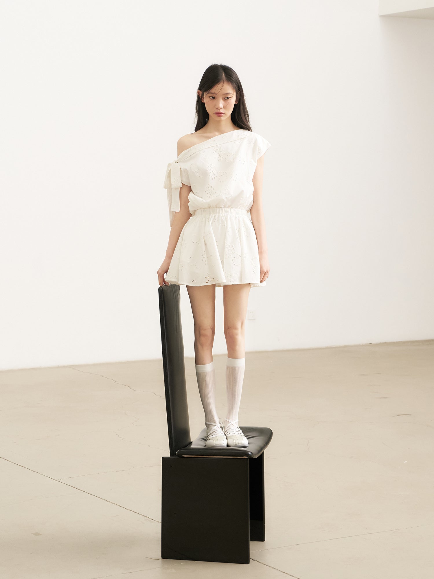 White French hollow flower off-shoulder dress with bow tie design and waist skirt R5131