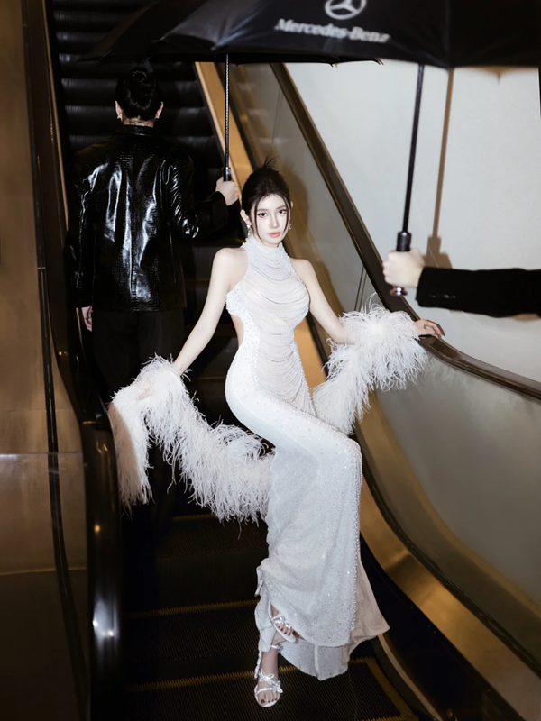 White Halter Neck Waist-Cinched Fitted Beaded Backless Sexy Floor-Length Prom Dress R7092
