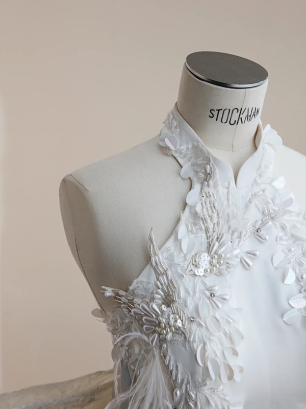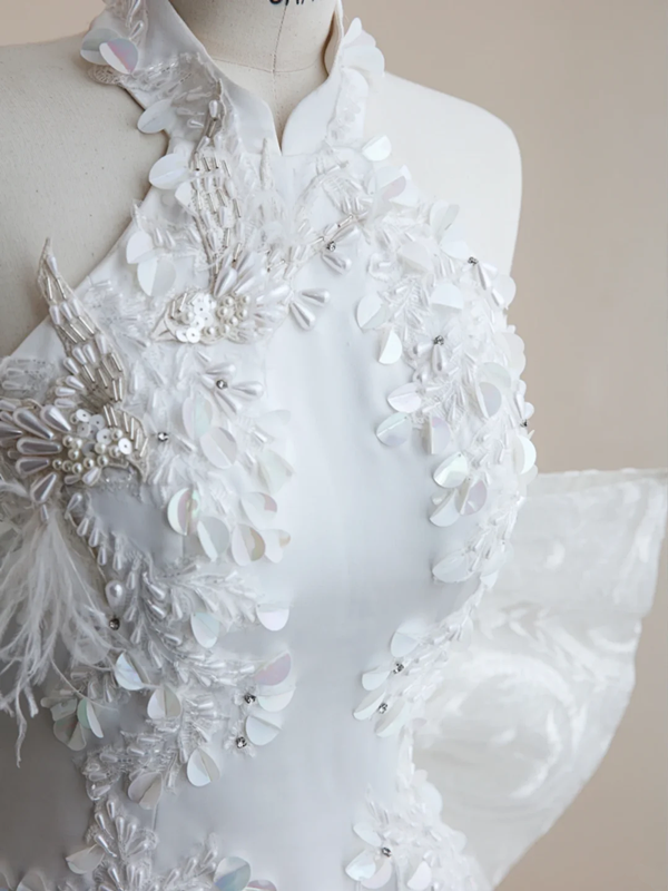 White halterneck sleeveless slim waisted hip-hugging fishtail elegant long dress, prom dress R5652